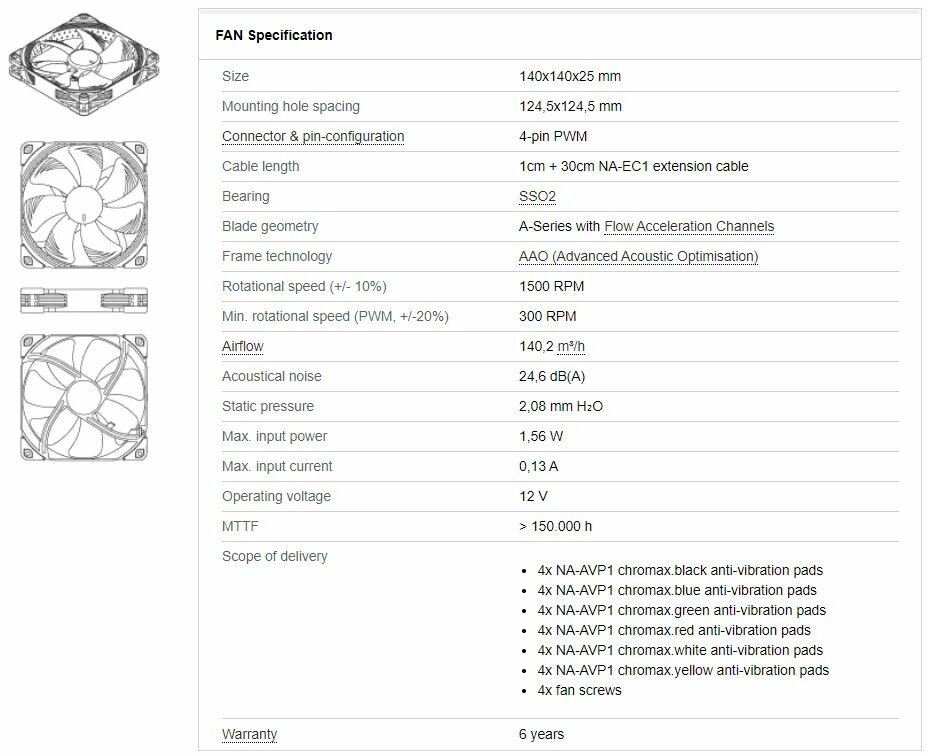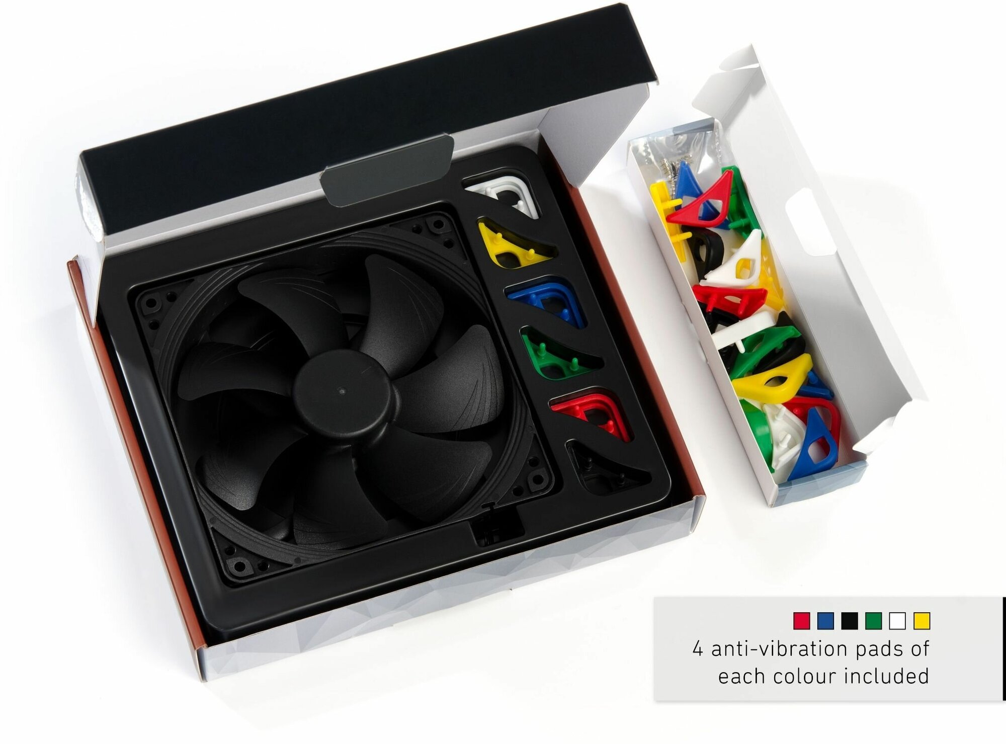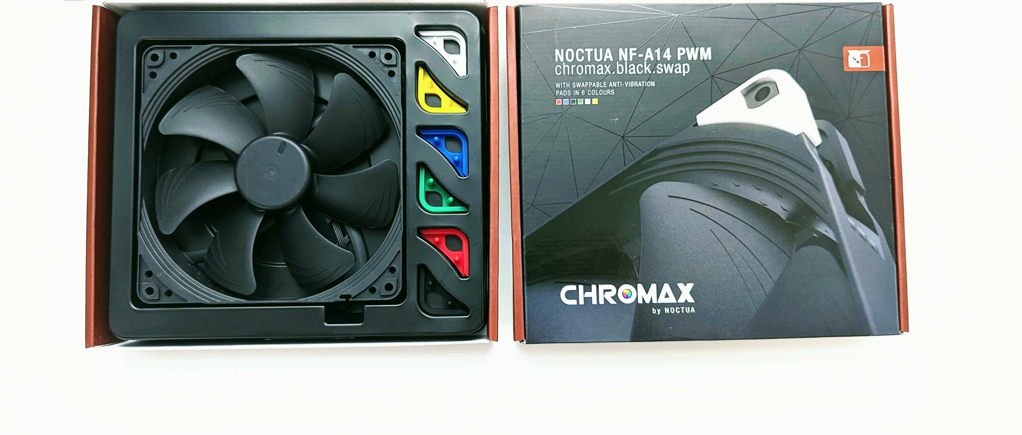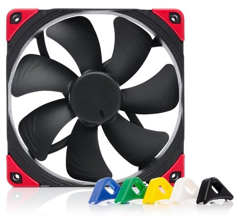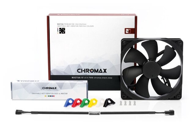 Версия Сhromax сочетает в себе тихую производительность охлаждения NF-A14 с привлекательным дизайном и набором переключаемых красных, белых, синих, зеленых, желтых и черных антивибрационных прокладок, которые позволяют настраивать цвета вентилятора для соответствия индивидуальным цветовым схемам.