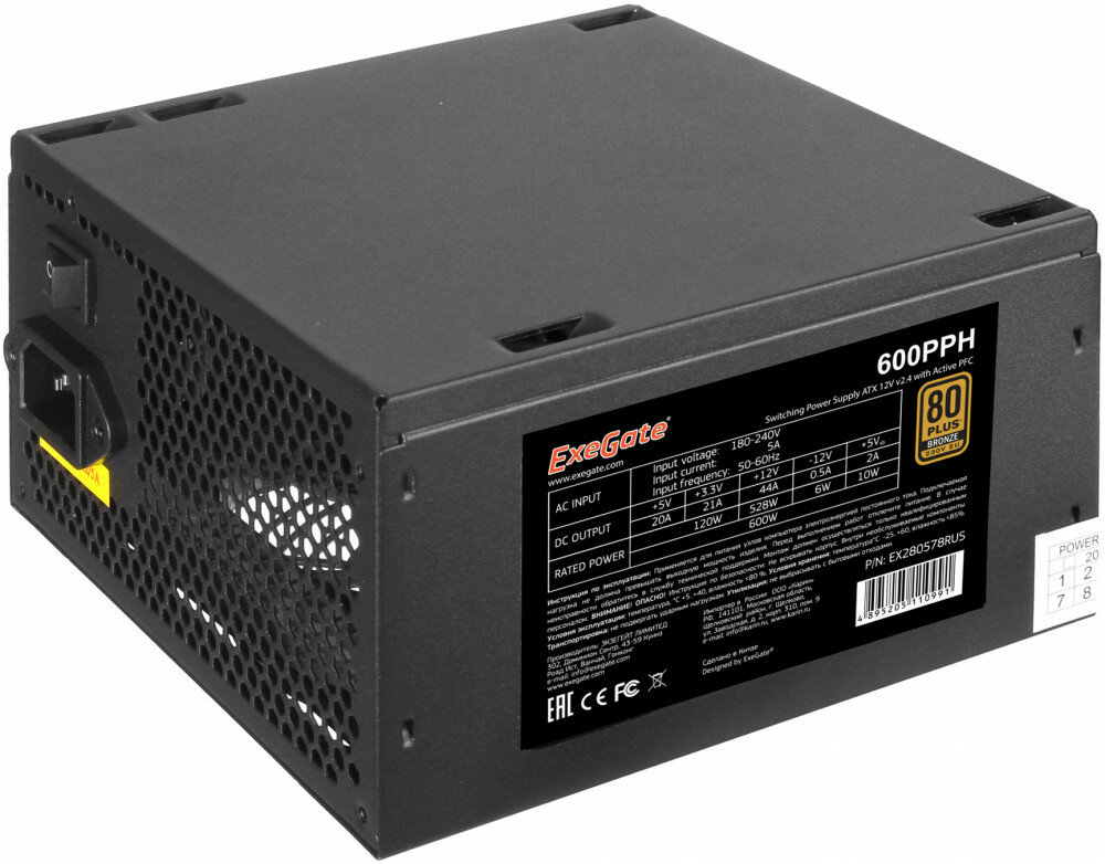 Сервис сравнения цен СкидкаГИД предлагает сравнить цены на товар «Блок питания ATX Exegate 600W RTL 80+Bronze black APFC 12cm 24p (4+4)p 5*SATA 3*IDE 600PPH»