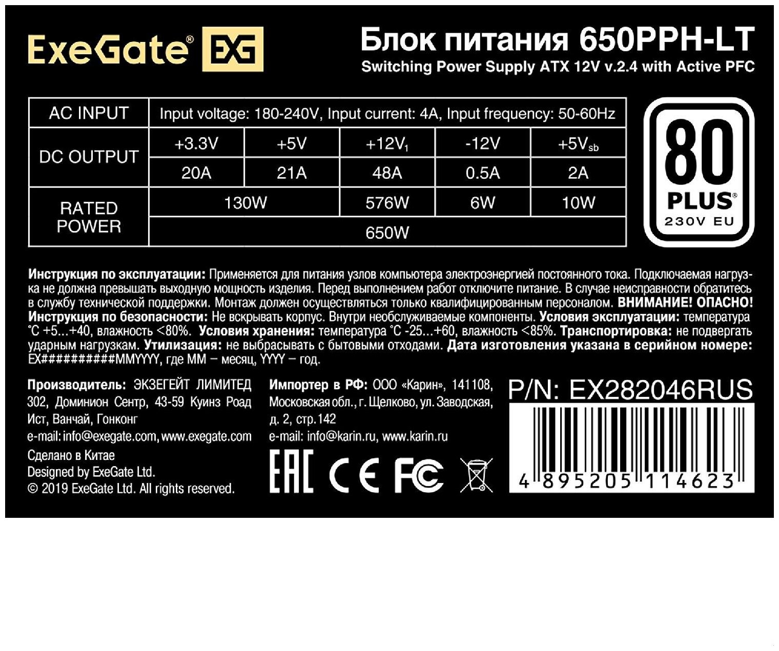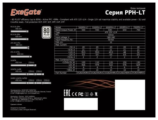 Блок питания ATX Exegate 650W 80+ black APFC 12cm 24p (4+4)p 5*SATA 3*IDE 650PPH-LT-OEM