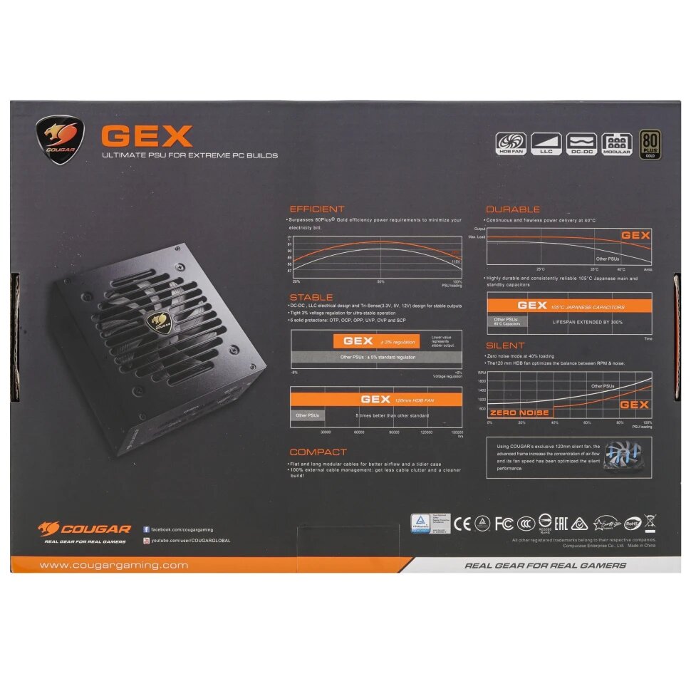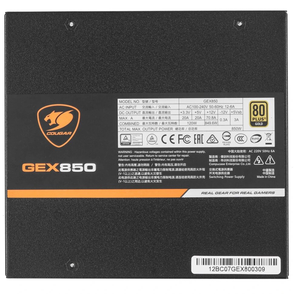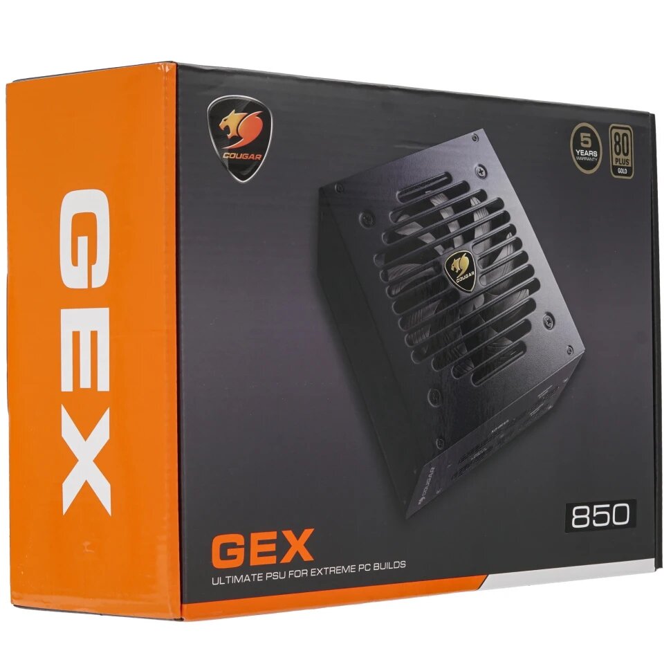 | Прочие особенности и свойства | Блок питания Cougar GEX850 [31GE085001P01] станет отличной основой для создания производительных игровых и рабочих станций. Номинальная мощность данной модели составляет 850 Вт, мощность на линии 12 В достигает 849.6 Вт. Источник питания использует в основе своей конструкции качественные компоненты, благодаря чему отличается высокой безопасностью и обладает защитой от перепадов напряжения, короткого замыкания, а также перегрузки. Также для предотвращения перегрева модель оснащена вентилятором диаметром 120 мм., Блок питания Cougar GEX850 [31GE085001P01] выполнен в корпусе формата ATX полностью модульного типа. Для основного подключения используется разъем (20+4)-pin. Подача энергии на процессор осуществляется при помощи 2 коннекторов (4+4)-pin. Для питания видеокарты используются 6 выходов (6+2)-pin. Также блок питания оснащен 8 разъемами 15-pin, благодаря чему вы сможете создать вместительное файловое хранилище из накопителей SATA. Комплект поставки включает в себя крепежные винты, а также набор кабелей и держателей для них. |