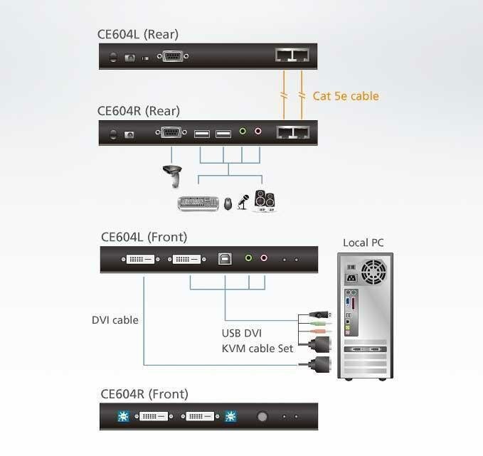 | Дополнительная информация | DVI USB KVM-удлинитель CE604 позволяет удаленно, на расстоянии до 60 м. от компьютера, подключить консоль управления оператора. Устройство состоит из двух модулей - локального CE604L и удаленного CE600R. Функционал устройства позволяет удаленно подключить клавиатуру и мышь с интерфейсом USB, динамики и микрофон. Функция Dual View обеспечивает возможность удаленного подключения двух мониторов к двум DVI видеовыходам видеокарты компьютера. |