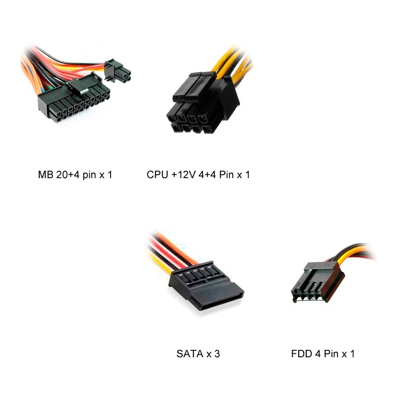 | Порты ввода-вывода | для материнской платы - 20+4 pin, 4-pin CPU - 1, 15-pin SATA - 3, 4-pin Floppy - 1 |