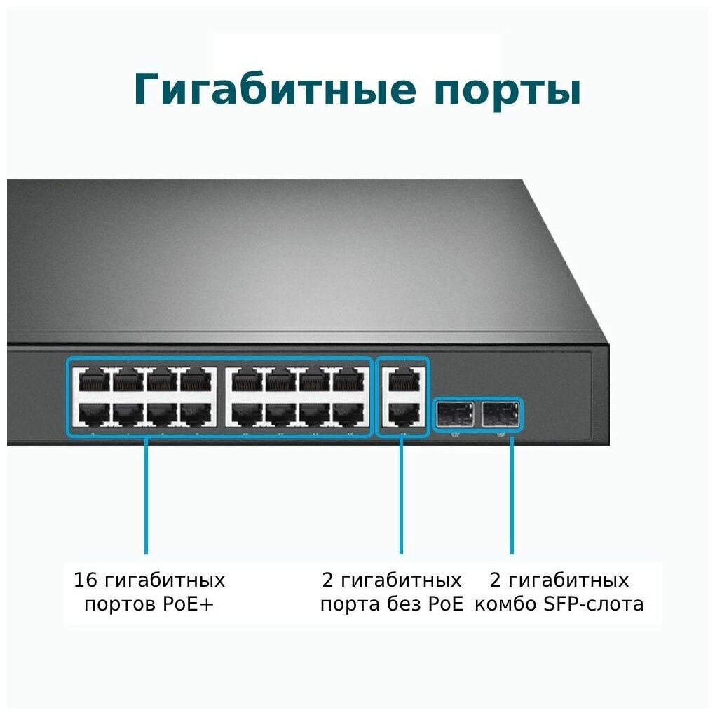 - 16 гигабитных PoE+ портов RJ45, 2 гигабитных порта RJ45 без PoE, 2 гигабитных комбо SFP‑слота