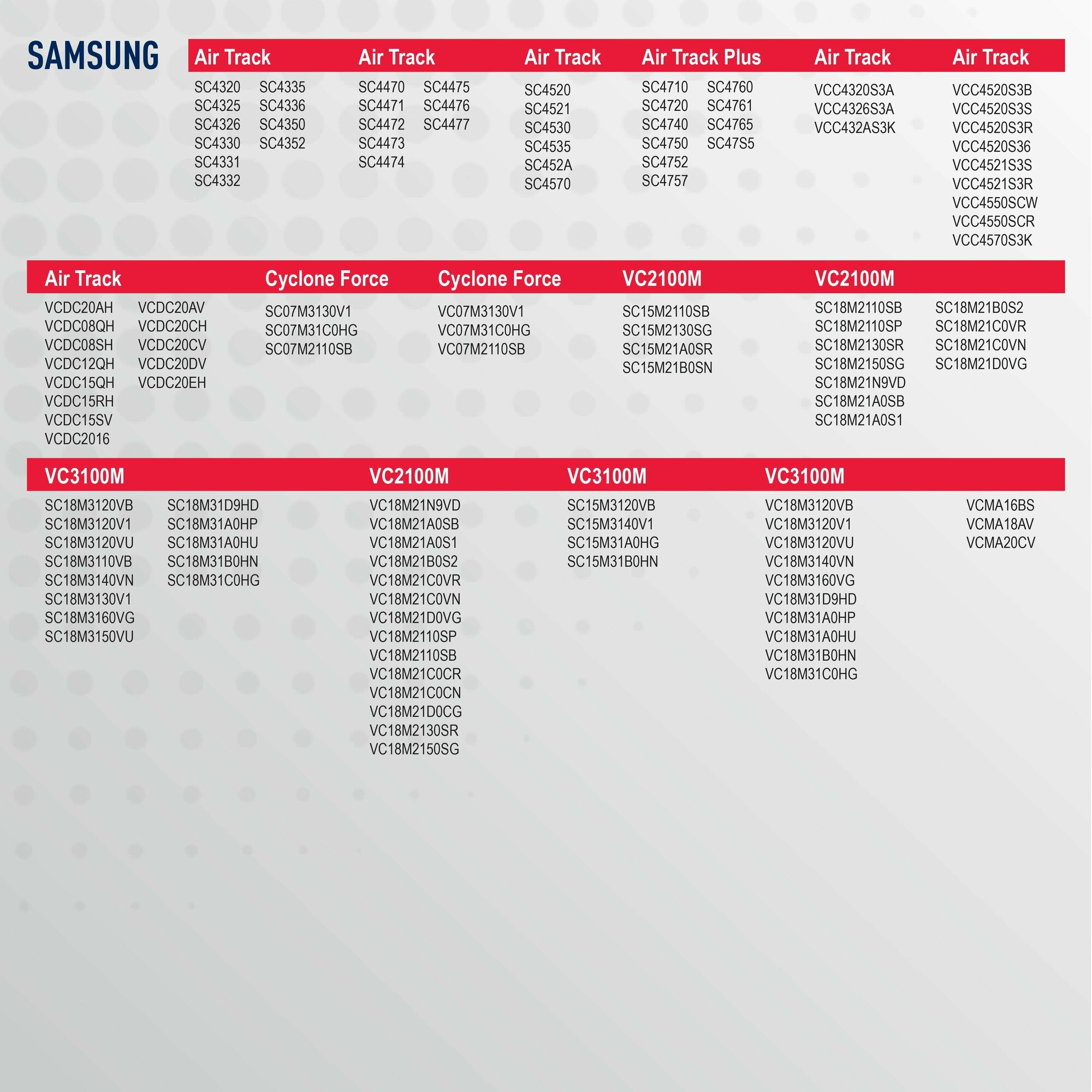 | Поддерживаемые модели пылесосов | SAMSUNG SC18M2150SG, SAMSUNG SC18M21D0VG, SAMSUNG SC18M21C0VN, SAMSUNG SC18M21C0VR, SAMSUNG SC18M21B0S2, SAMSUNG SC18M21A0S1, SAMSUNG SC18M21A0SB, SAMSUNG SC18M2130SR, SAMSUNG SC15M2130SG, SAMSUNG SC18M2110SP, SAMSUNG SC18M2110SB, SAMSUNG VCMA20CV, SAMSUNG VCMA18AV, SAMSUNG 4740, SAMSUNG SC4477, SAMSUNG SC15M2110SB, SAMSUNG SC15M21A0SR, SAMSUNG SC4475, SAMSUNG SC18M31A0HU, SAMSUNG SC15M31B0HN, SAMSUNG SC15M31A0HG, SAMSUNG SC15M3140V1, SAMSUNG SC15M3120VB, SAMSUNG SC18M31C0HG, SAMSUNG SC18M31B0HN, SAMSUNG SC18M31A0HP, SAMSUNG SC15M21B0SN, SAMSUNG SC18M3150VU, SAMSUNG SC18M3160VG, SAMSUNG SC18M3140VN, SAMSUNG SC18M3110VB, SAMSUNG SC18M3120V1, SAMSUNG SC18M3120VB, SAMSUNG SC4476, SAMSUNG SC4474, SAMSUNG SC 4335, SAMSUNG SC 4332, SAMSUNG SC 4331, SAMSUNG SC 4330, SAMSUNG SC 4326, SAMSUNG SC4472, SAMSUNG SC 4336, SAMSUNG SC 4350, SAMSUNG SC 4352, SAMSUNG SC 4471, SAMSUNG SC4325, SAMSUNG SC 47S5, SAMSUNG SC 4765, SAMSUNG SC 4757, SAMSUNG SC 4710, SAMSUNG SC 452A, SAMSUNG SC 4521, SAMSUNG SC 4761, SAMSUNG SC 4752, SAMSUNG SC 4750, SAMSUNG SC 4530, SAMSUNG SC 4520, SAMSUNG SC 4473 |