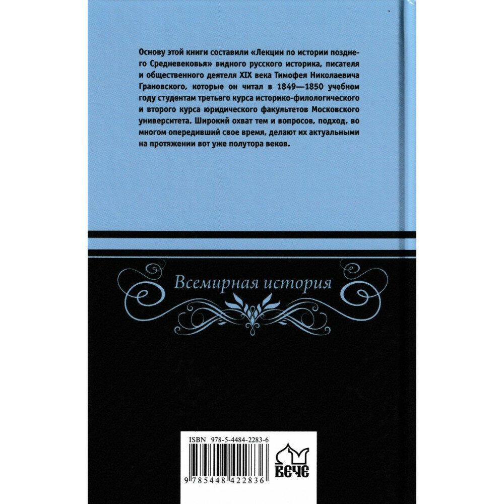 Основу этой книги составили «Лекции по истории позднего Средневековья» видного русского историка, писателя и общественного деятеля XIX века Тимофея Николаевича Грановского, которые он читал в 1849/50 учебном году студентам третьего курса историко-филологического и второго курса юридического факультетов Московского университета. Широкий охват тем и вопросов, подход, во многом опередивший свое время, делают их актуальными на протяжении вот уже полутора веков.
