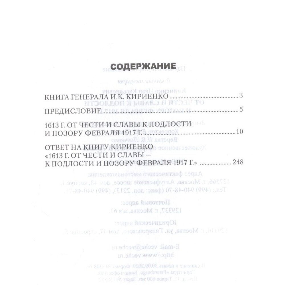 Автор этого необычного и малоизвестного произведения – Иван Касьянович Кириенко (1881–1971). Его главный труд вышел, можно сказать, к 45-летию Добровольческого движения, в 1963 г., в Бразилии. Настоящее название его, снятое с обложки рассматриваемого издания, но оставшееся в оглавлении – «1613 г. От чести и славы к подлости и позору февраля 1917 г.». Состоит из четырёх текстов: введения К. К. Семенова (на 1 стр.), самой работы И. К. Кириенко и послесловия к ней некоего Н. Потоцкого (объемом в 240 стр.) и ответа на труд Кириенко участников Добровольческого движения (на 85 стр.). Нет никаких примечаний, что неудобно.