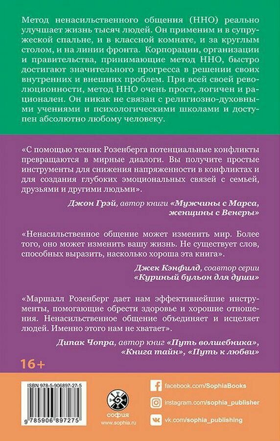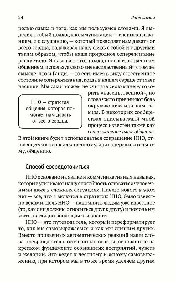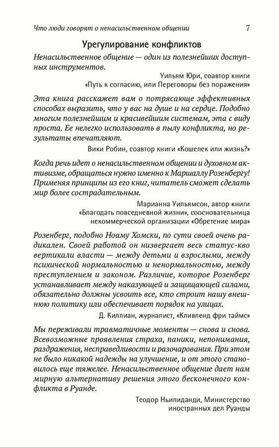 Книга очень понравилась, читается легко, написана понятным и доступным языком. Автор предлагает интересный метод «ненасильственного общения» который может существовать в повседневной жизни и быть действительно эффективным. После прочтения каждой главы книги возникает желание понаблюдать за общением в контексте «слушать и слышать». Порекомендую эту книгу друзьям!