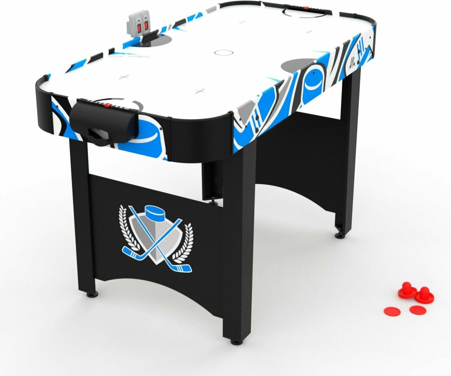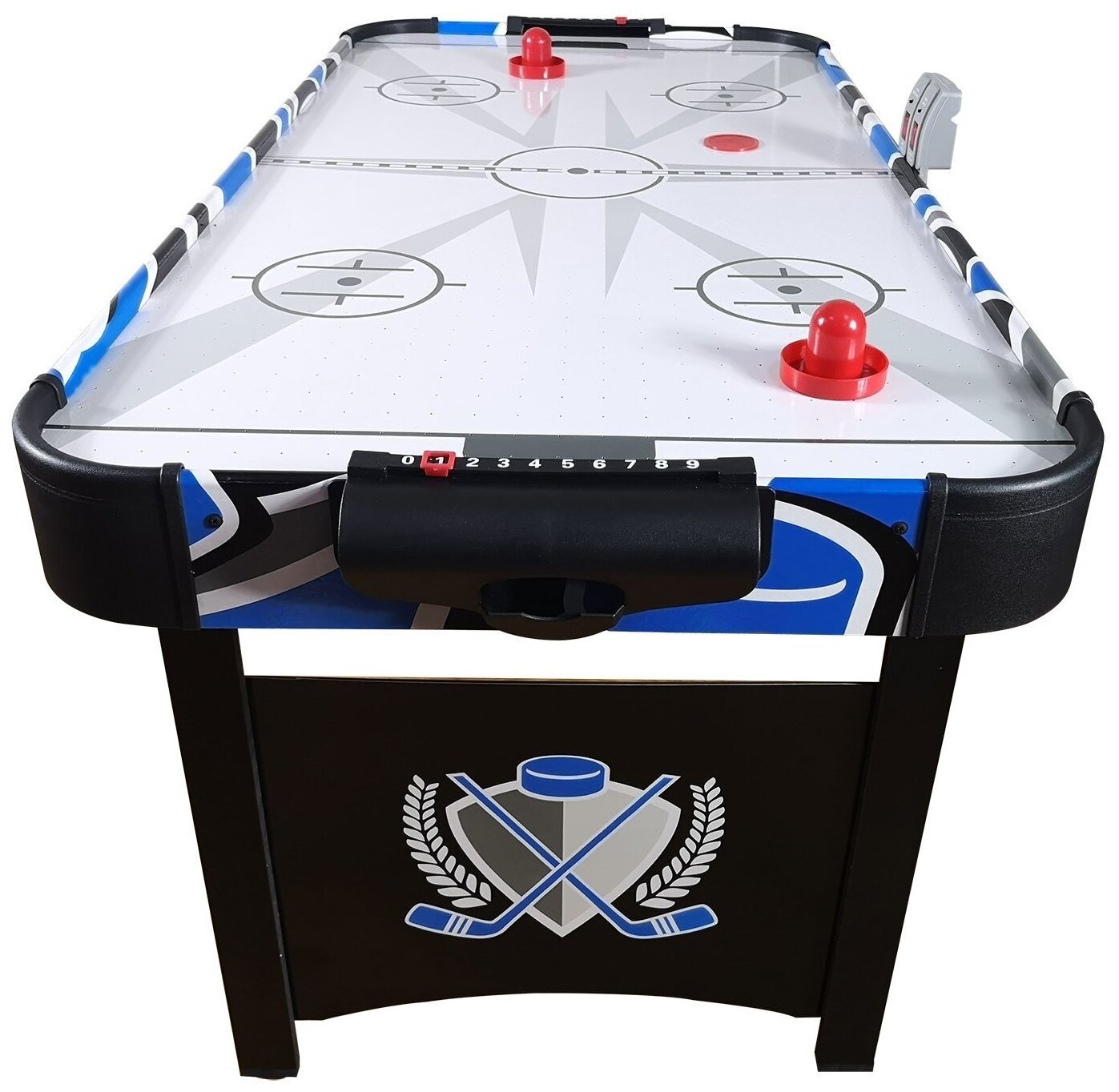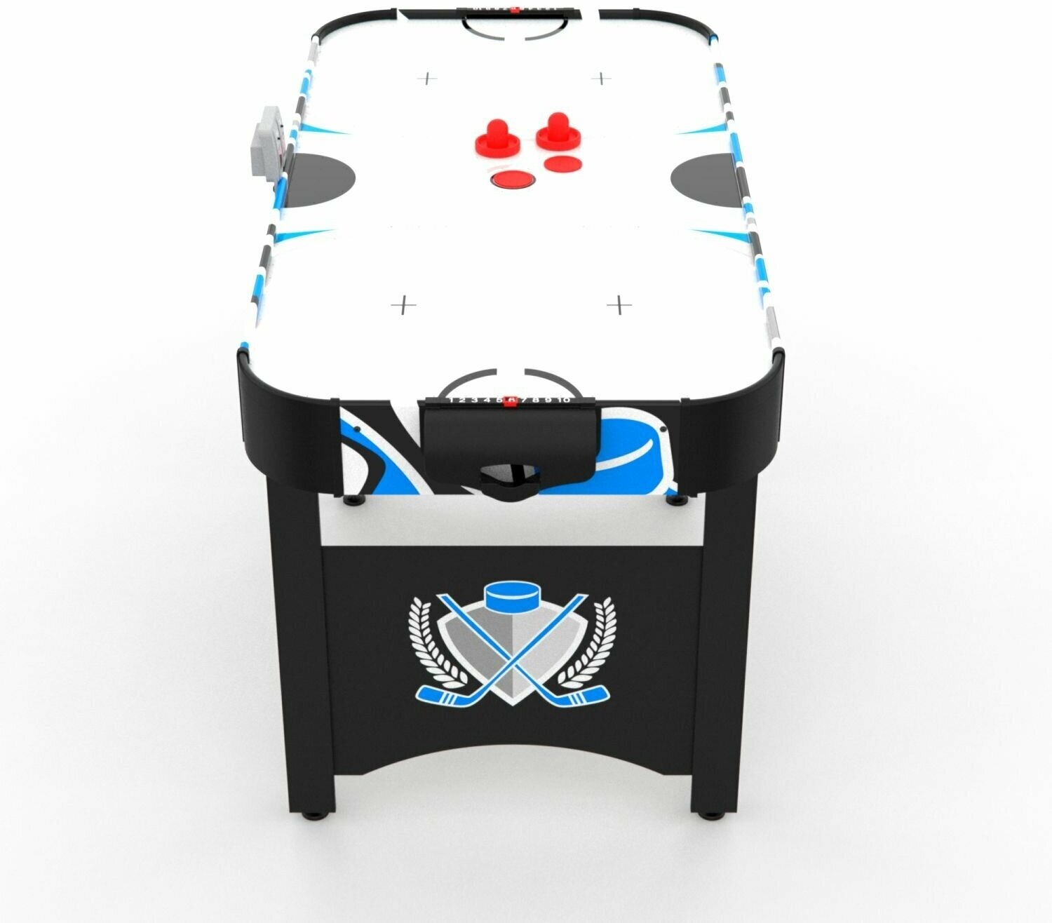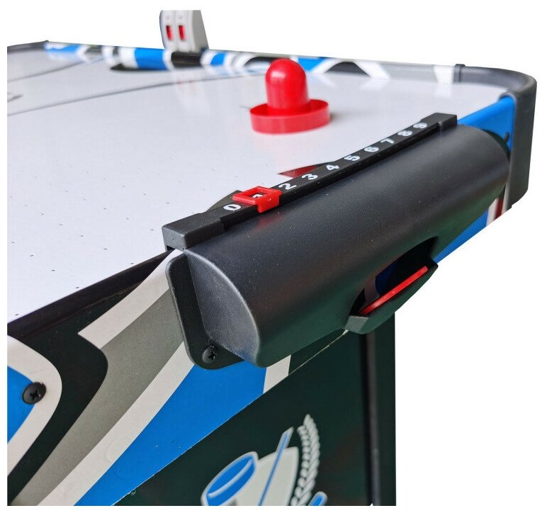 Игровой стол будет не только отличной покупкой для себя, но и прекрасным подарком. Игра в аэрохоккей очень эмоциональная, захватывающая и проходит на больших скоростях. Почувствуйте звуки и атмосферу знаменитой и популярной игры! Аэрохоккей является отличным развлечением дома или на даче. Аэрохоккей оборудован электронным табло для подсчета забитых шайб. И дополнительно возле каждого игрока установлен механический счетчик. Стол комплектуется необходимым для игры набором аксессуаров: 2 биты и 2 шайбы красного цвета.