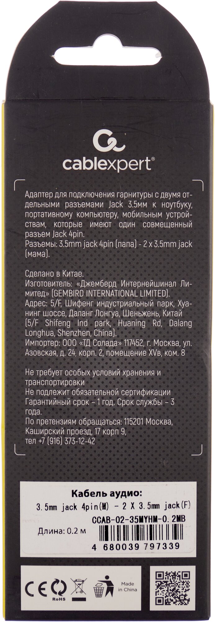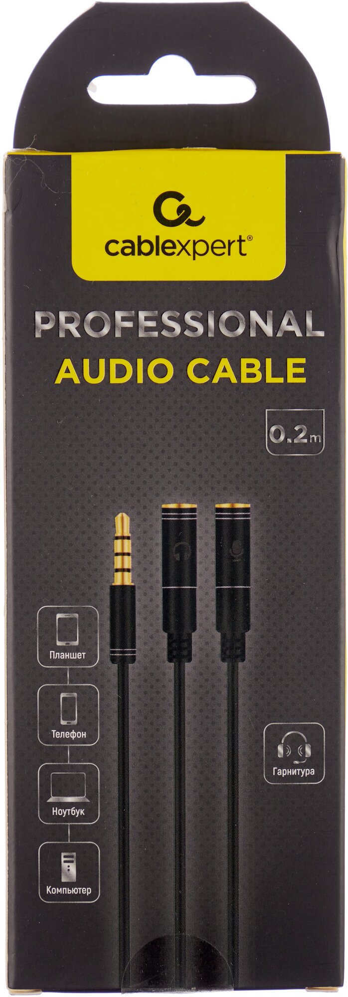 | Наименование модели | Cablexpert 3.5 Jack 4pin M - 2х3.5 Jack F 0.2m Black CCAB-02-35MYHM-0.2MB |