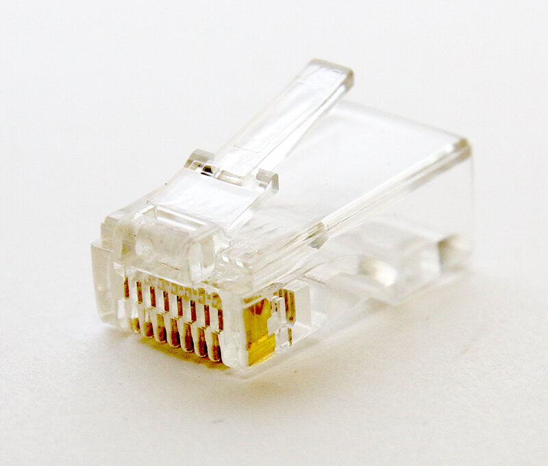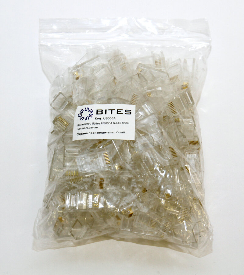 5bites RJ-45 8p8c US005A представляет собой обжимной коннектор для "витой пары". Данный коннектор не разочарует Вас своими функциональными возможностями и скоростью передачи данных, а также не будет причинять неудобств в виду простоты и аскетичности своей конструкции. Представленная модель соответствуют требованиям категории - 5е, ножи контакта выполнены из сплава меди с золотым напылением.