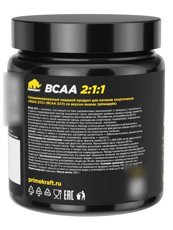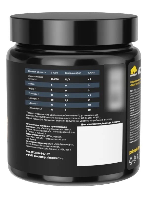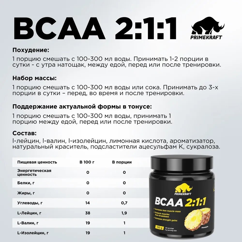 ВСАА от Primekraft - незаменимый элемент для построения красивого рельефного тела, а также заряд энергии и силы для более эффективных тренировок. Рекомендуется для питания в соответствии с программой, разработанной для данных видов спорта, под наблюдением спортивного врача или специалиста по спортивному питанию.