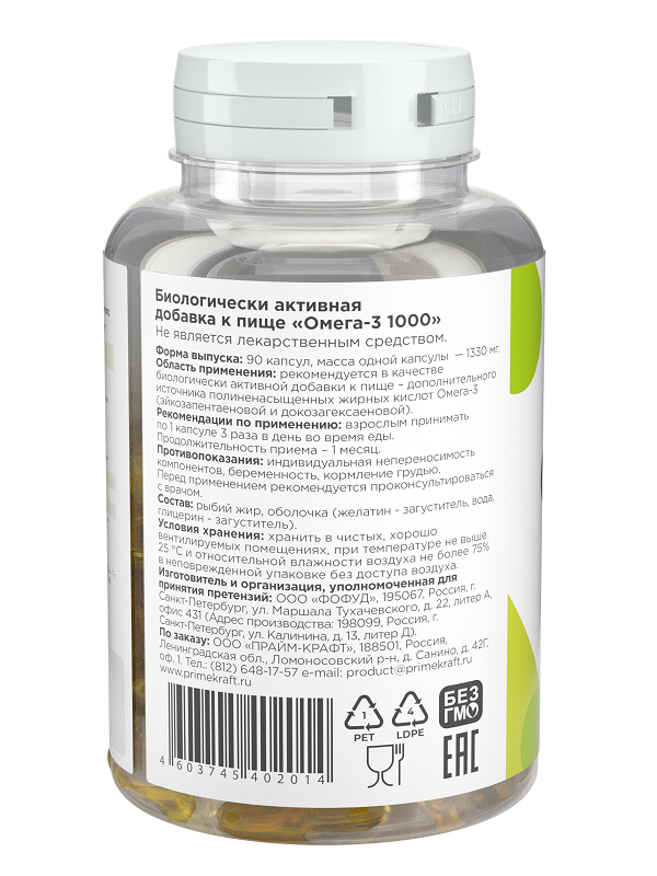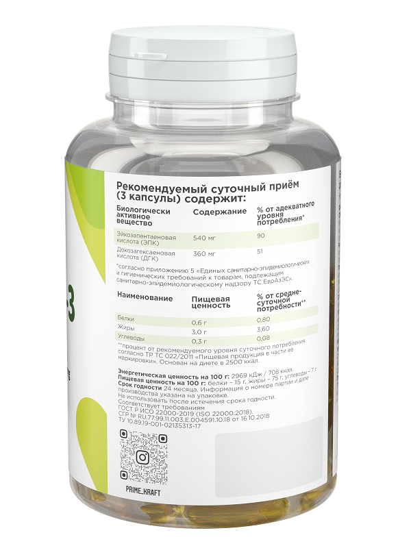 Омега-3 необходимы для нормального функционирования организма человека. Однако, современный человек, как правило, потребляет пищу с низким содержанием Омега-3. При недостаточном поступлении Омега-3 в организм человека происходит замещение недостающих полиненасыщенных жирных кислот производными других жирных кислот. Эти изменения, в конечном итоге, могут привести к серьезным нарушениям в работе иммунной системы, внутренних органов, нарушению зрительной, репродуктивной функций. Таким образом, достаточное поступление с пищей омега-3 является важным условием поддержания здоровья. Омега-3 от компании Prime Kraft - это незаменимая добавка для любого человека, который заботится о своем здоровье и здоровье своих близких.Пищевая ценность в порции 5 г. на 100 г. Калории 30 ккал 600 ккал Белки 3 г 60 г Жиры 3 г 60 г Углеводы 0 г 0 г Ингредиенты : рыбий жир очищенный, оболочка капсулы (желатин пищевой, глицерин, вода деминерализованная, сорбит, ароматизатор этилванилин), смесь токоферолов (антиокислитель). Содержание полиненасыщенных жирных кислот Омега-3 не менее 35%, в том числе эйкозапентаеновой кислоты С 20:5 - не менее 18%, докозагексаеновой кислоты С 22:6 - не менее 12%.Взрослым и детям старше 14 лет по 1-4 капсуле 1-2 раза в день во время еды.