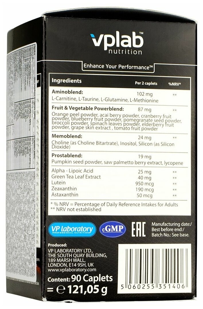| Состав | fruit & vegetable powerblend (порошок апельсиновой корки, порошок ягод асаи, порошок ягод клюквы, порошок ягод черники, порошок плодов граната, порошок брокколи, порошок листьев шпината, порошок ягод бузины, порошок кожуры винограда, порошок томата), memoblend (холин, инозитол, кремний, бор), prostablend (порошок семян тыквы, экстракт ягод saw palmetto), альфа-липоевая кислота, экстракт листьев зеленого чая, лютеин, зеаксантин, астаксантин |