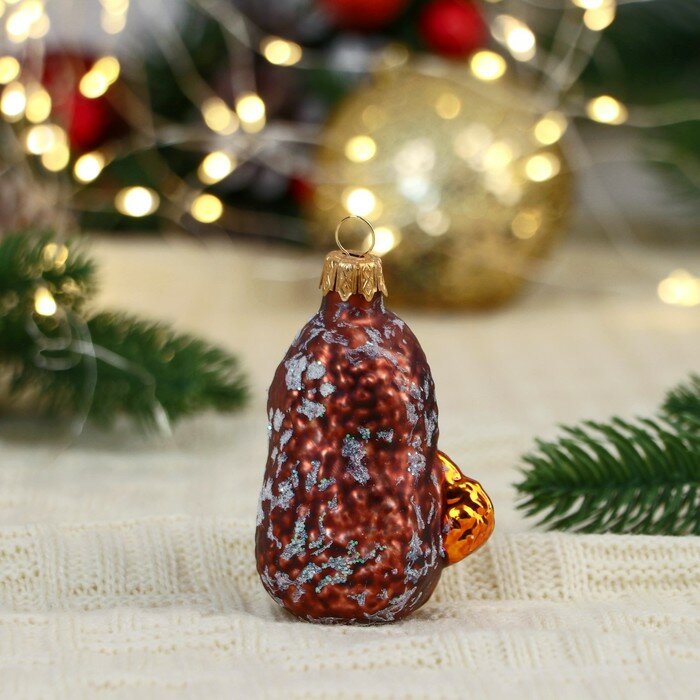 Игрушка выполнена из стекла, имеет блестящее покрытие и крепится на подвеске для удобства размещения на ветке.