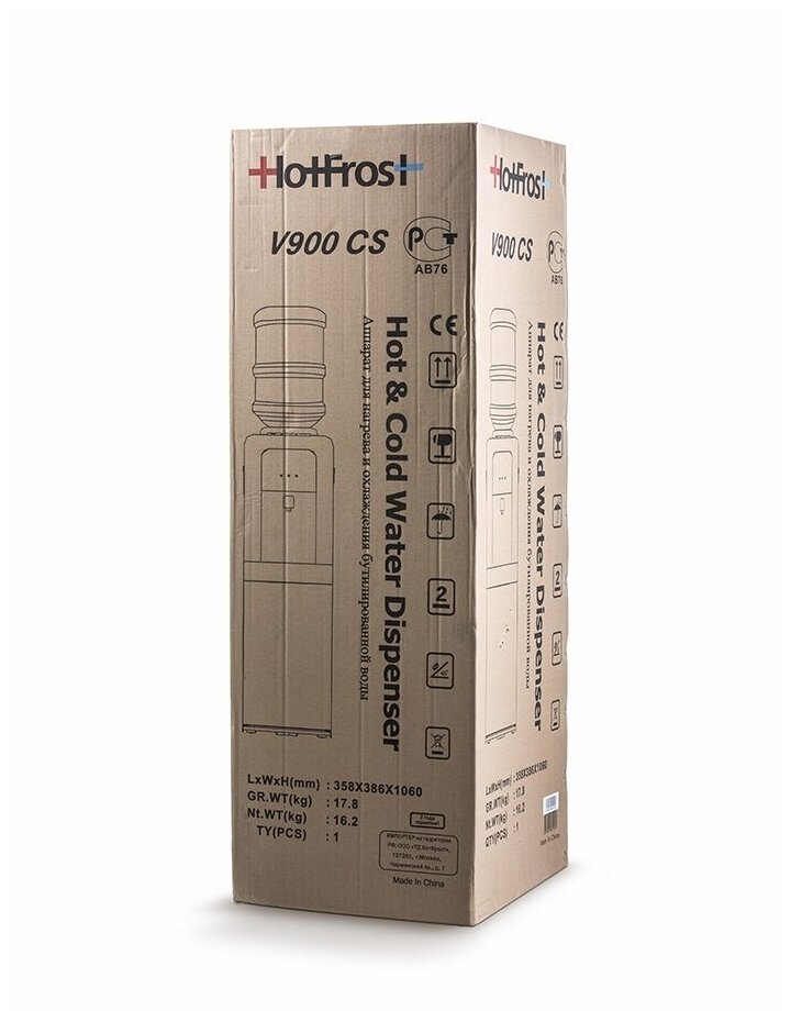 Напольный кулер для воды HOTFROST. С верхней загрузкой бутыли и встроенным шкафчиком для посуды. С нагревом и компрессорным охлаждением. Потребляемая мощность 540 Вт. Тип установленных кранов: Нажим клавишей. С защитой от случайного ошпаривания. Цвет: Серебро.