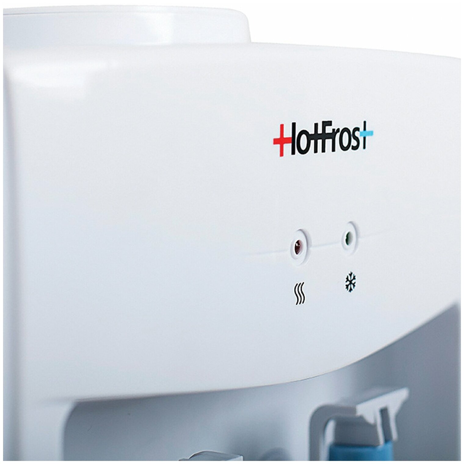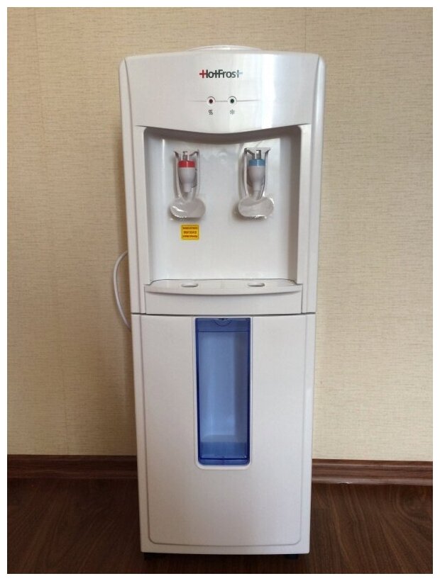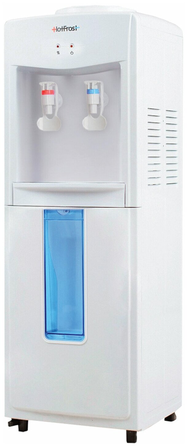 HotFrost — недорогой, но в то же время надежный кулер для воды, который станет идеальным решением для покупателя, делающего свой выбор в пользу выгодного сочетания «цена/качество». Для слива воды в кулере установлены краники нажимного типа, интуитивно понятные в использовании. Такой тип краников позволяет пользователю не напрягаться и не вникать в особенности работы с механизмом аппарата, а просто напиться воды, что, собственно говоря, и должен обеспечивать кулер. Наличие нажимных краников избавляет владельцев данной модели от излишних контактов с поверхностями кулера, что действительно очень гигиенично. Кроме этого, кулер оборудован откидным шкафчиком для хранения пластиковых стаканчиков. Эти факторы позволяют использовать этот кулер в местах массового скопления людей.
