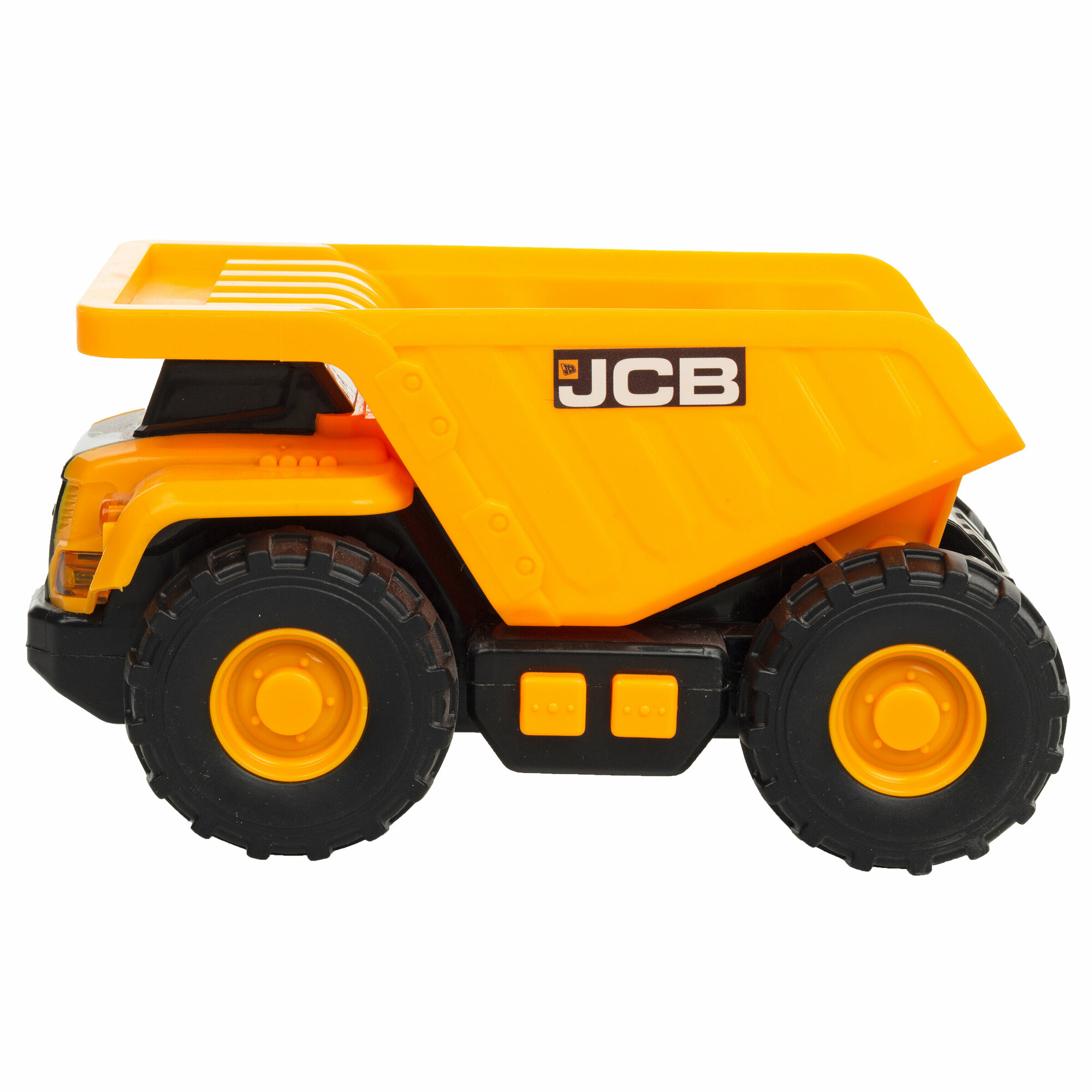 Самосвал JCB из пластика, механический со светом и звуком, оснащен подвижными механизмами на петлях кузова, а все контуры, формы и узлы машины почти полностью копируют реальную модель. За счет этого самосвал выглядит совсем как настоящий, а функции света и звука еще больше добавляют игрушке реалистичности.