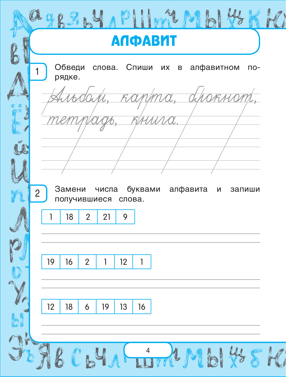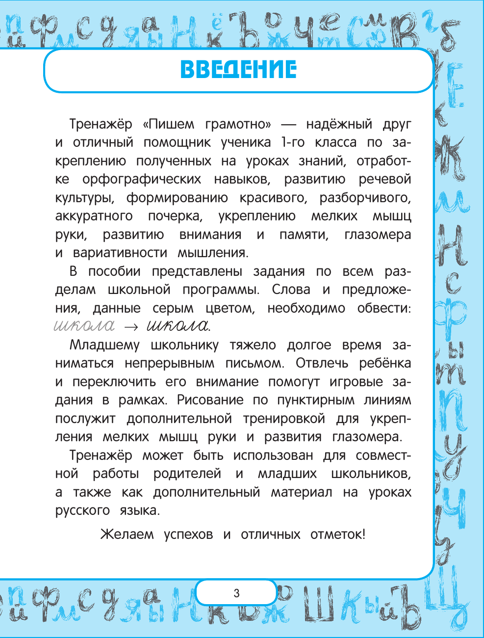 Тренажёр — отличный помощник первоклассника по закреплению знаний, отработке орфографических навыков, развитию речевой культуры, формированию красивого, разборчивого, аккуратного почерка, укреплению мелких мышц руки, развитию внимания, памяти, глазомера и вариативности мышления. В пособии представлены материалы по всем разделам школьной программы. Слова и предложения, написанные серым цветом, необходимо обвести.