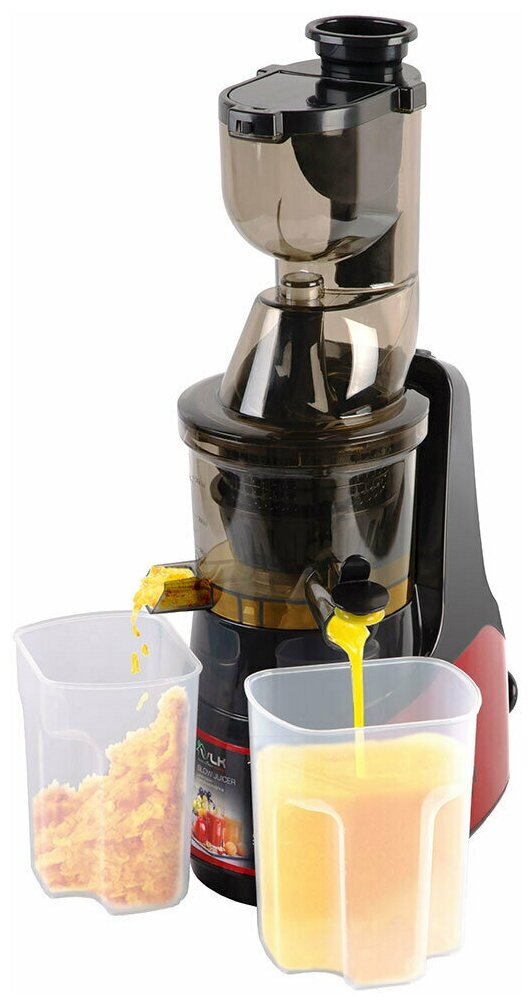 Механизм соковыжималки VLK произведен по особой форме, благодаря строению которого, достигается максимальный отжим продуктов. Простота подачи кусочков в соковыжималку, гарантирует безопасность и легкость процесса отжима. А вертикальное расположение позволяет выжимать на 40% больше сока из любых продуктов, оставляя мякоть сухой. На выходе получается больше сока чем у центробежных соковыжималок: до 90% от апельсинов; до 83% от груши; до 75% от яблок и сельдерея; до 49% от моркови и свеклы. Такой тип соковыжималок основан на измельчении и протирании продуктов сквозь решетку с помощью шнека, что позволяет сохранить витамины, полезные вещества и естественный аромат продуктов, так как при этом методе отжима не происходит нагрева сырья во время работы, сок не окисляется, как при использовании центробежных соковыжималок. Скорость работы соковыжималки VLK не превышает 46 об/мин, имитируя движения руками выжимающими сок, за счет чего не происходит нагрев и окисление, сохраняются чувствительные к теплу питательные вещества, витамины А и С, живые ферменты, микроэлементы, потерянные высокоскоростными соковыжималками, а также образуется меньше пены. Мощный низкоскоростной метод получения сока с минимальной теплоотдачей, делает это устройство практически бесшумным во время работы. Модель имеет широкое загрузочное отверстие 75 мм, что позволяют загружать многие фрукты и овощи целиком, не нарезая их предварительно на части. Особой функцией данной модели является функция «Реверс». Иногда при переработке очень твердых или волокнистых овощей и фруктов двигатель может внезапно остановиться, в этом случае, чтобы освободить шнек, поможет функция «реверс». Также приятной особенностью модели VLK , является функция анти-капля. Соковыжималка имеет фиксатор на выходное отверстие для сока, что предотвращает попадание капель на рабочую поверхность стола. В комплект соковыжималки VLK также входят 2 резервуара для сбора готового сока и мякоти, их объем 1 л. и 0,7 л. VLK просто собирается и легко моется после использования. При перегреве или неправильной сборке происходит автоматическое отключение устройства. Компактный размер и стильный дизайн шнековой соковыжималки VLK легко впишет ее в интерьер кухни самой взыскательной хозяйки!