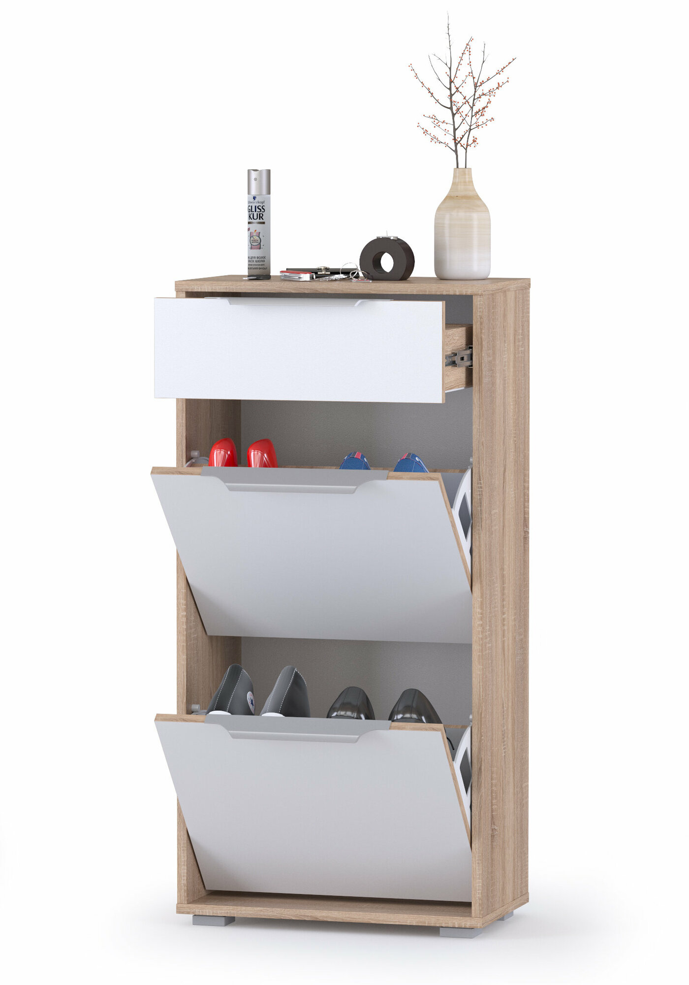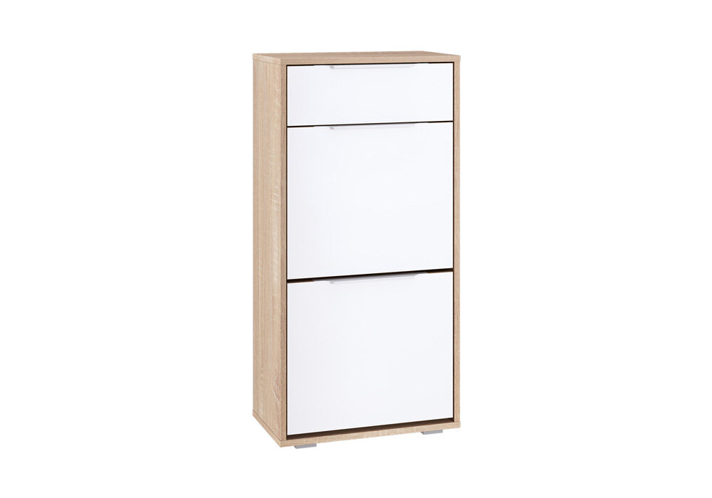 Тумба для обуви высокая Куба, компактная и многофункциональная, интересна индивидуально и в композициях.Стильная тумба для обуви высокая Куба оборудована выдвижным ящиком для мелочей и двумя нишами для обуви за откидными фасадами.Откидные двери тумбы для обуви высокой Куба снабжены механизмом со специальными полками для размещения обуви.Удобная высота обувницы, 102 см., позволит использовании её в качестве подставки для сумок или подзеркальника.Корпус и фасад выполнены из ламинированной ДСП 16 мм. Опоры - серый пластик, лицевая фурнитура - металл.