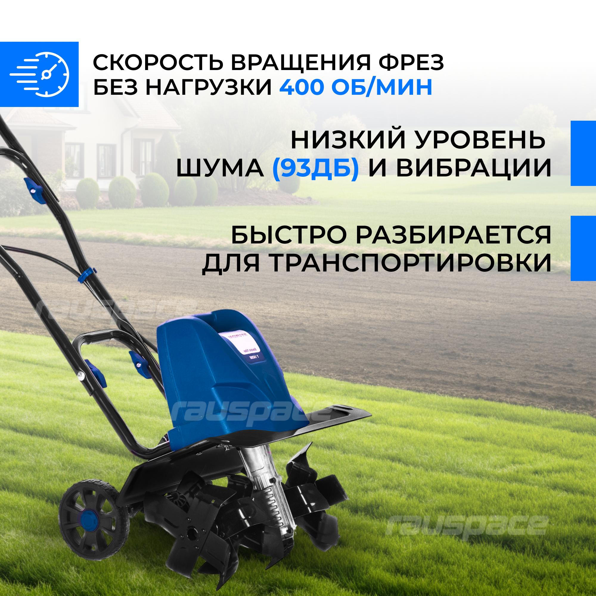 Культиватор подходит женщинам и пожилым людям за счет простоты эксплуатации. Весит всего 12 кг, что делает его маневренным и послушным в управлении. В отличие от бензиновых моделей, электрический культиватор намного тише работает, проще в обслуживании и создает меньше вибраций.Компактность