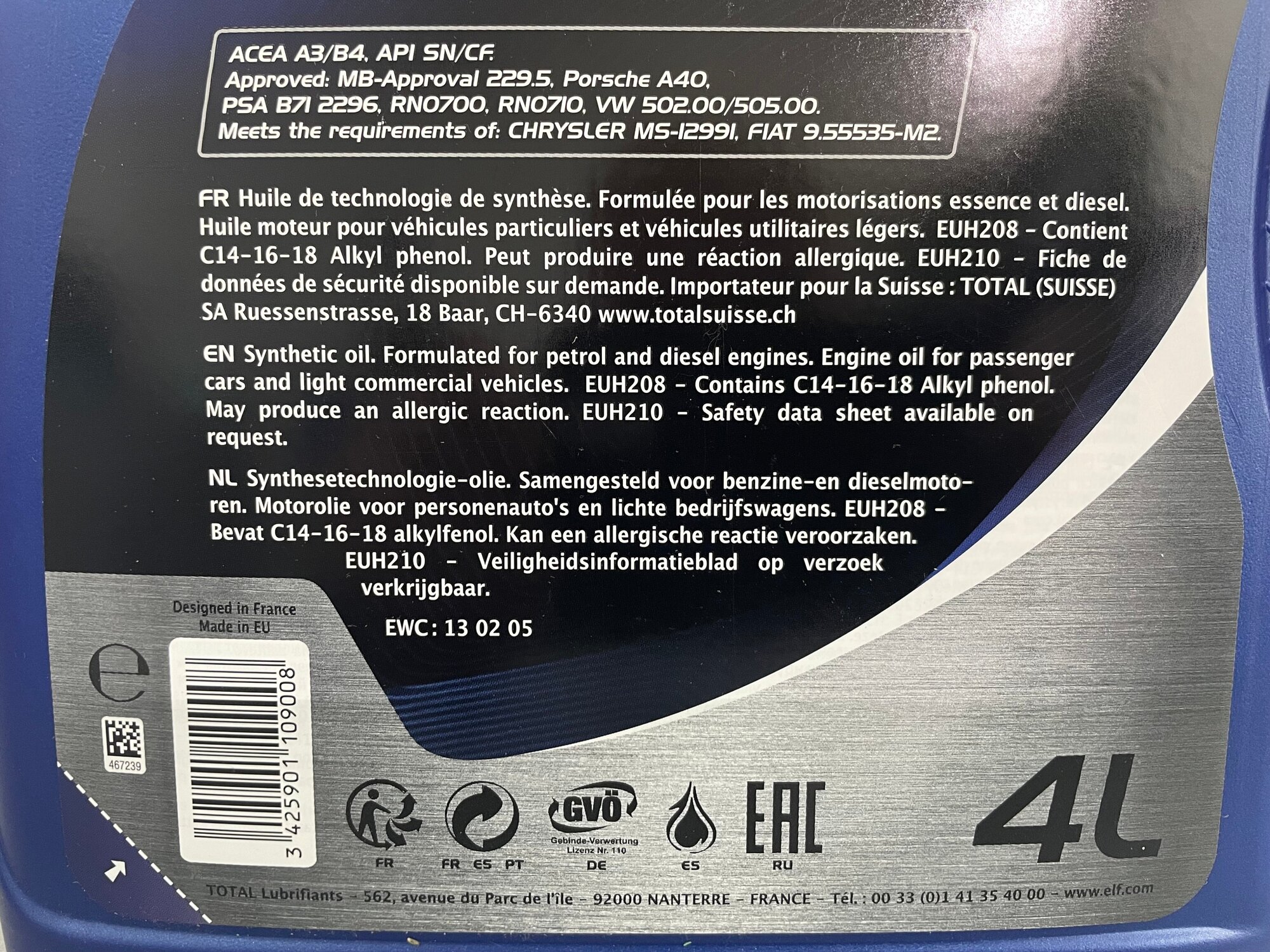 | Допуски OEM | RN0710/RN0700, MB-Approval 229.5, PORSCHE A40, VW 502.00 / VW 505.00, PSA B71 2296, CHRYSLER MS-12991 / FIAT 9.55535-M2 |