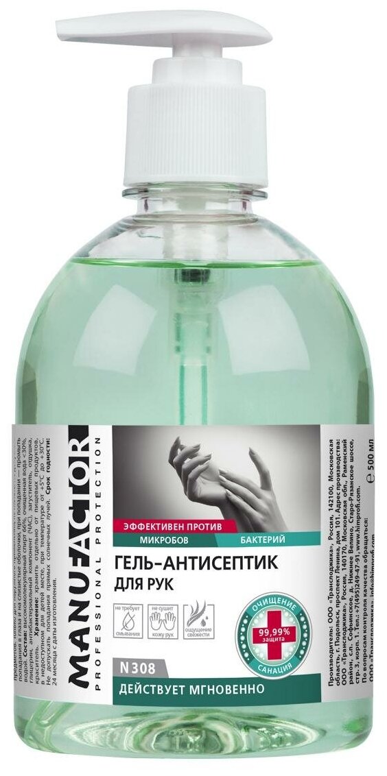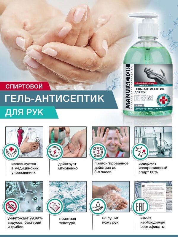 Гель-антисептик применяется для гигиенической обработки рук. Обеспечивает тщательное очищение без применения воды, оказывает антибактериальное действие. Основное действующее вещество — изопропиловый спирт. Убивает 99,99% наиболее распространенных болезнетворных бактерий и грибов.