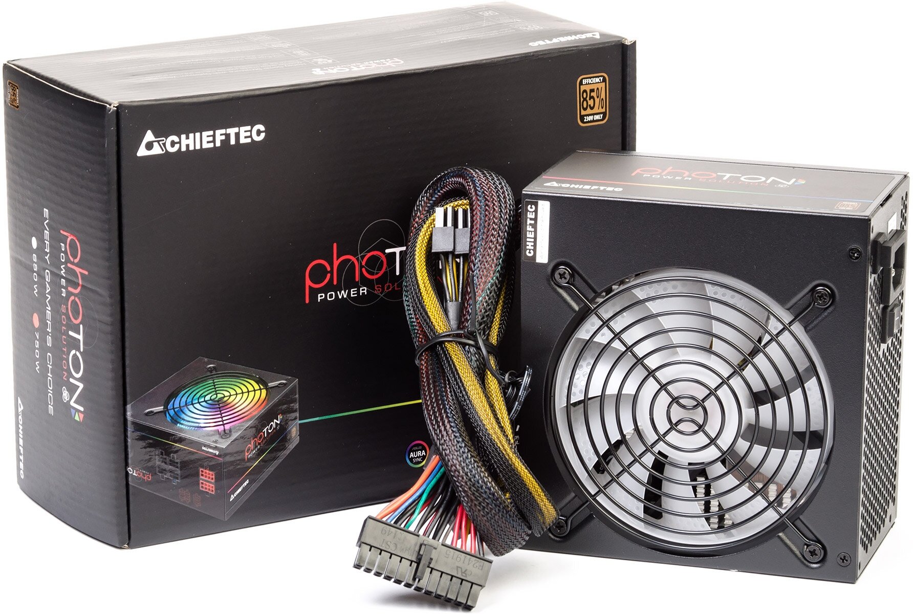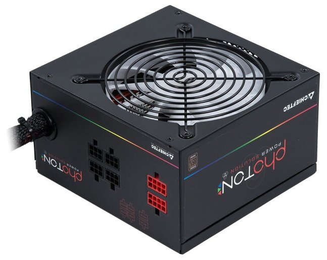 Блок питания Chieftec Photon 750W украшен эффектной многоцветной подсветкой. Устройство поддерживается системами управления подсветкой. Система кабелей блока питания – полумодульная. Длина главного кабеля питания – 50 см. Длина кабеля питания процессора составляет 59 см. Чуть менее длинный (55 см) кабель питания PCI-E. Помимо модульных кабелей, в комплектацию блока питания входит кабель, необходимый для подключения к электрической сети. Вес источника питания – 1.52 кг.