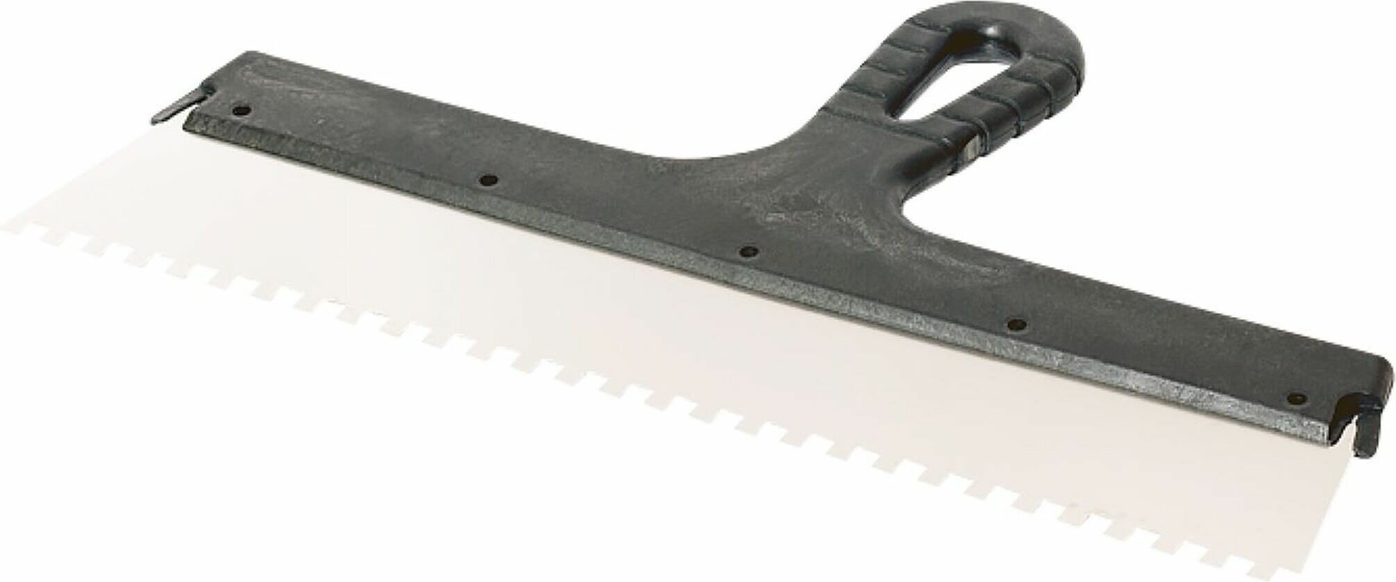 Шпатель зубчатый – оснащен эргономичной пластмассовой ручкой, основной рабочей частью шпателя является металлическое полотно, поэтому для производства шпателей мы используем нержавеющую сталь. Сталь данной марки обладает улучшенными механическими свойствами. Используются шпатель для нанесения и выравнивания клеевых и штукатурных составов на поверхности большой площади.