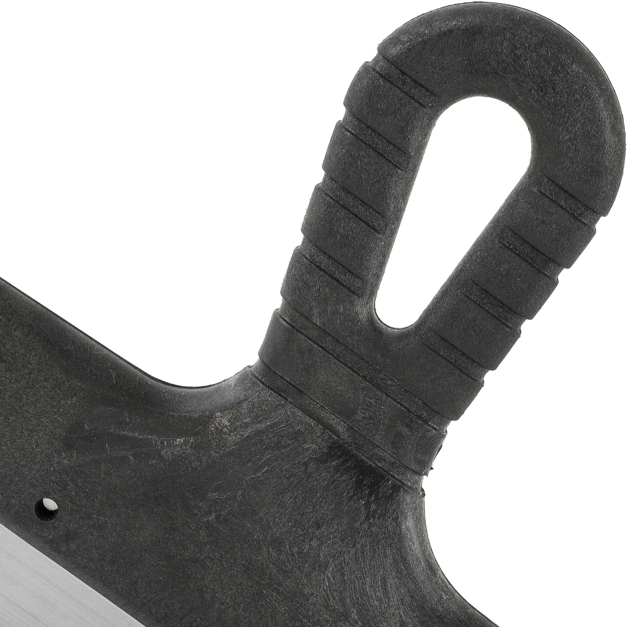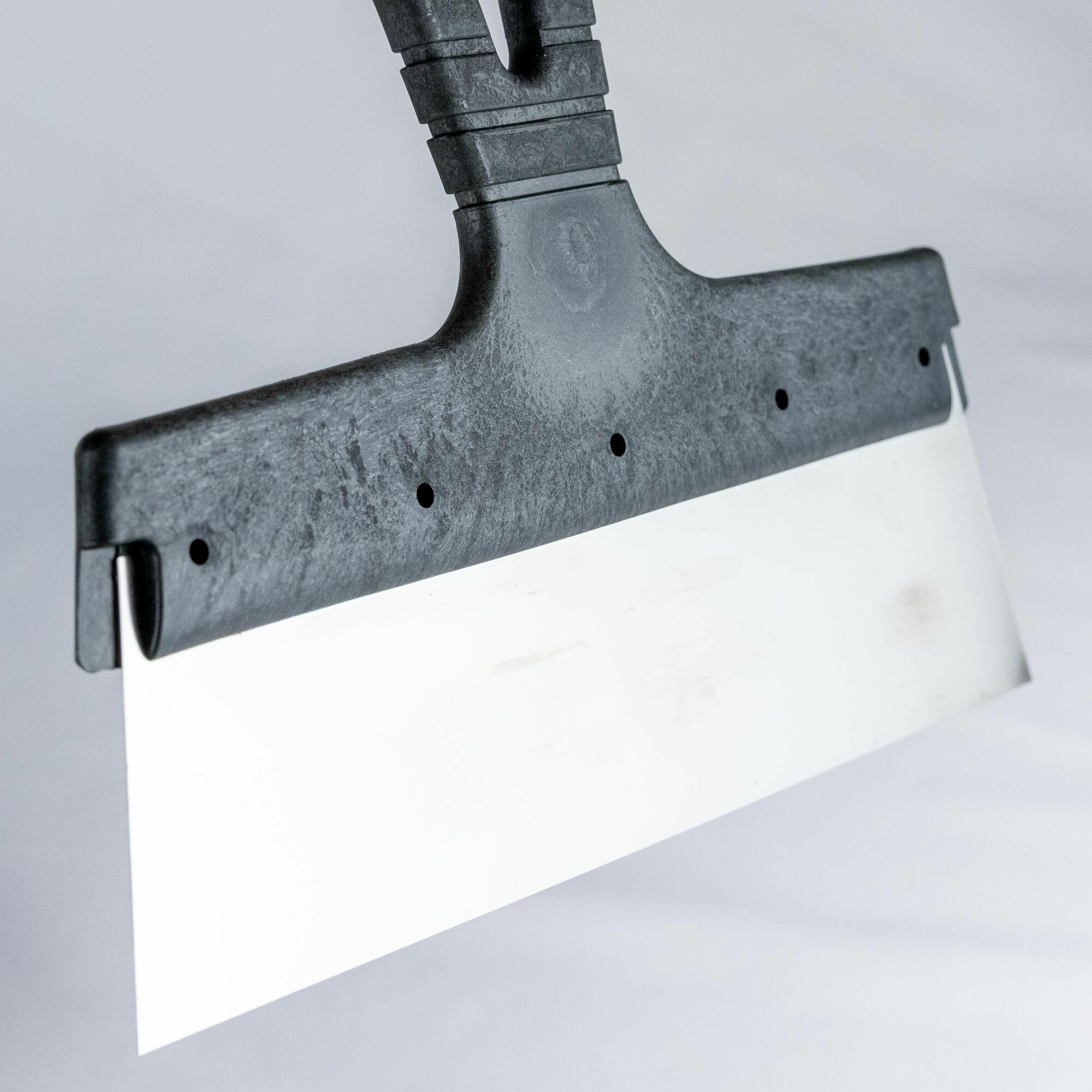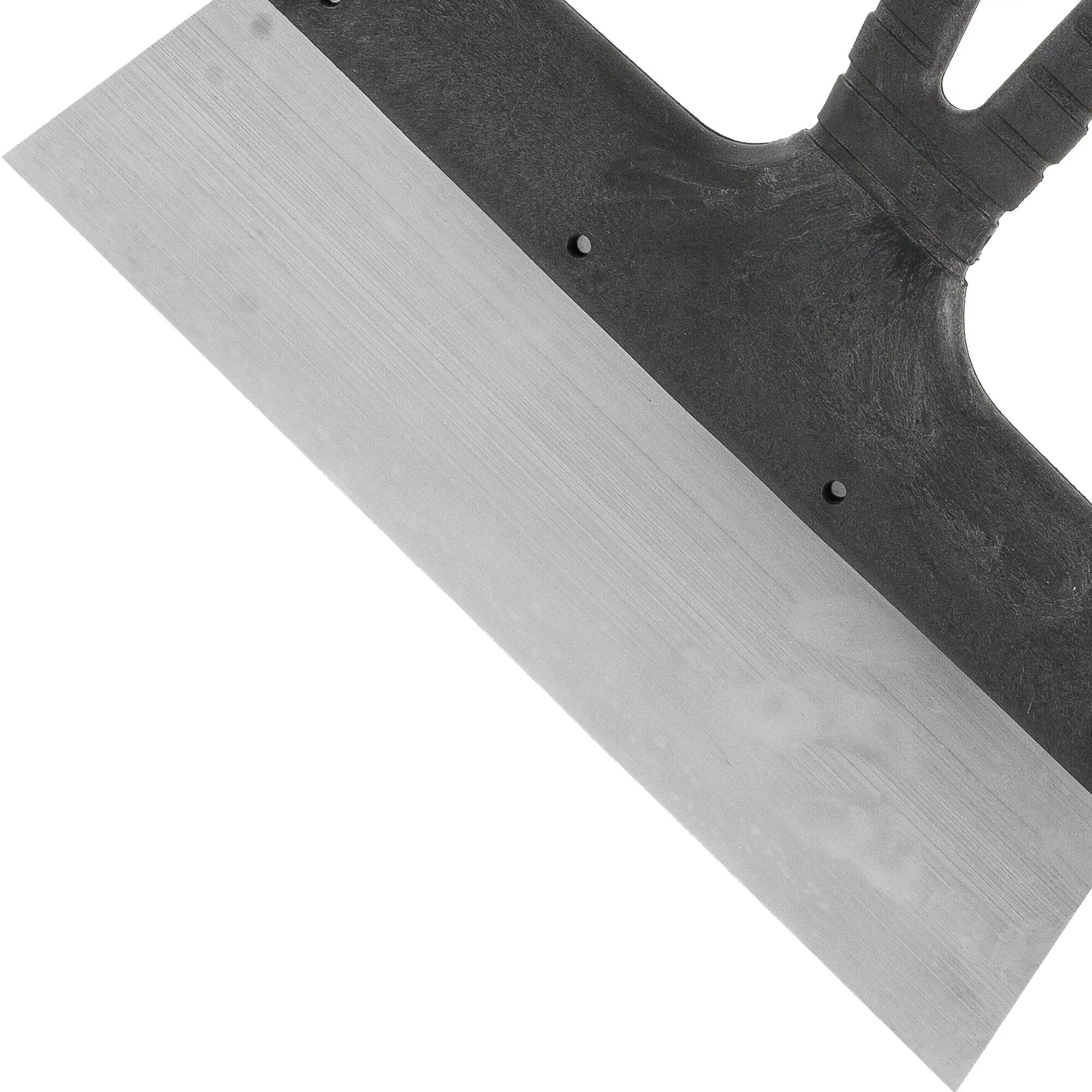 Фасадный шпатель – оснащен эргономичной пластмассовой ручкой, основной рабочей частью шпателя является металлическое полотно, поэтому для производства шпателей мы используем нержавеющую сталь. Сталь данной марки обладает улучшенными механическими свойствами. Используется шпатель для нанесения, выравнивания и доводки различных строительных растворов на обрабатываемых поверхностях большого размера.