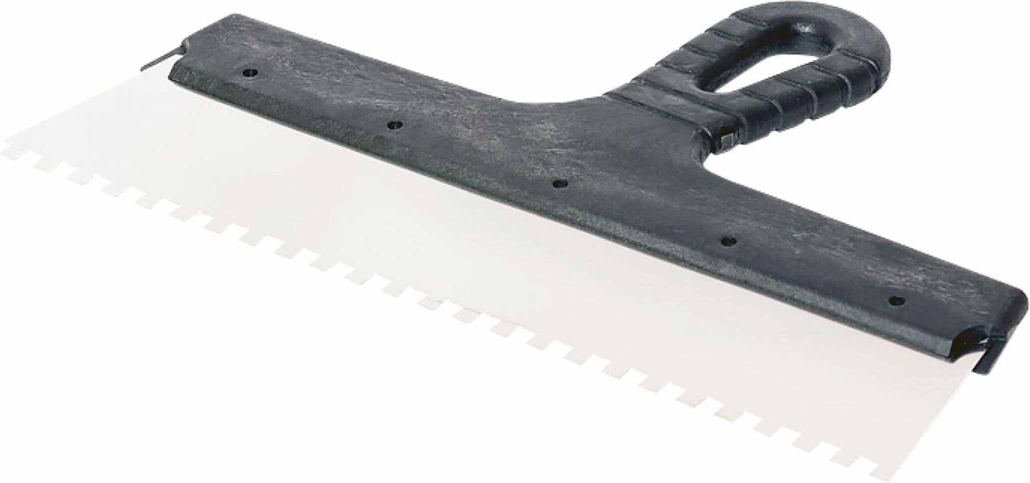 Шпатель зубчатый – оснащен эргономичной пластмассовой ручкой, основной рабочей частью шпателя является металлическое полотно, поэтому для производства шпателей мы используем нержавеющую сталь. Сталь данной марки обладает улучшенными механическими свойствами. Используются шпатель для нанесения и выравнивания клеевых и штукатурных составов на поверхности большой площади.