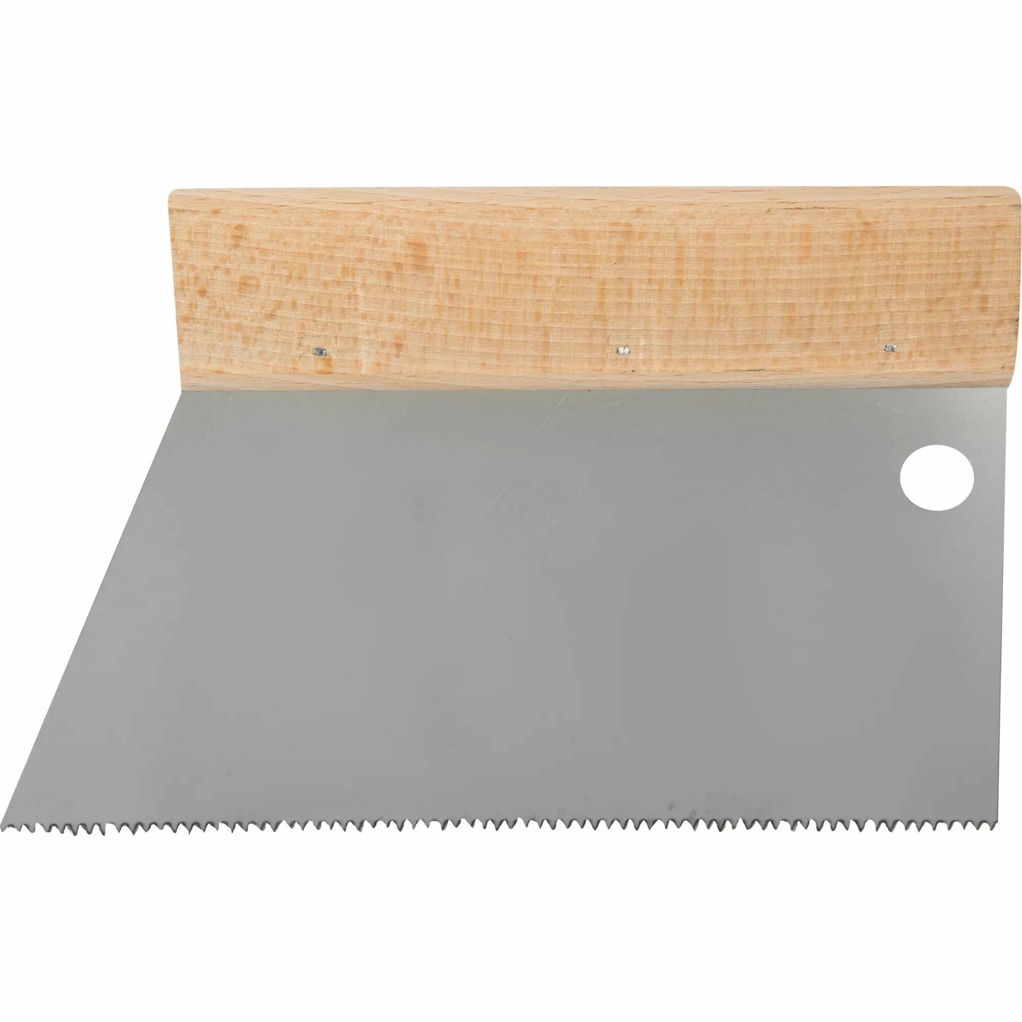 Предназначен для нанесения клеевых материалов на основание при укладке напольных покрытий. Обеспечивает равномерное и экономичное нанесение клея. Эргономичная деревянная ручка из бука. Полотно из нержавеющей стали.