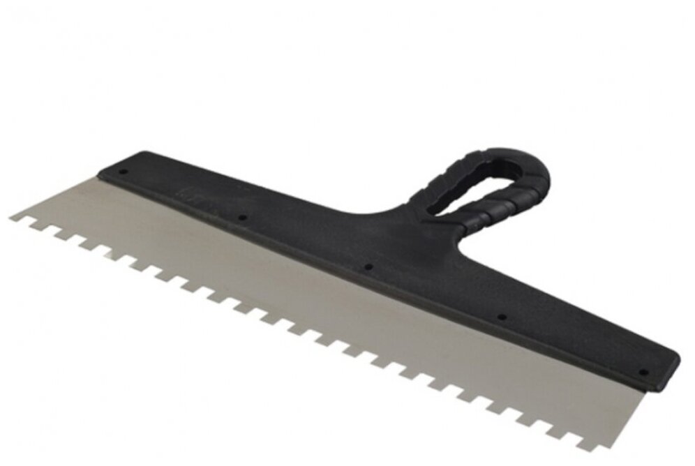 Шпатель зубчатый – оснащен эргономичной пластмассовой ручкой, основной рабочей частью шпателя является металлическое полотно, поэтому для производства шпателей мы используем нержавеющую сталь. Сталь данной марки обладает улучшенными механическими свойствами. Используются шпатель для нанесения и выравнивания клеевых и штукатурных составов на поверхности большой площади.