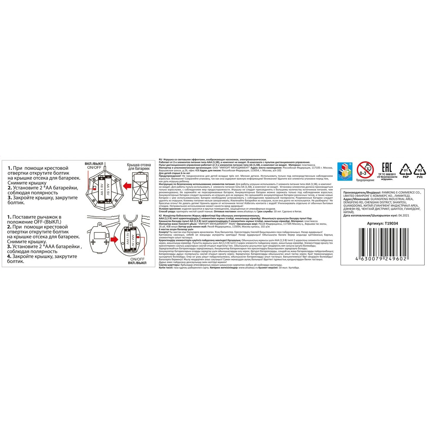 Внимание! Для работы игрушки и дистанционного пульта необходимы батарейки.