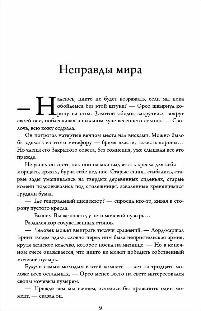 Первая же глава сразу чётко рисует ситуацию – если у Орсо ещё завалялись какие-то сомнения, заседание Закрытого Совета не оставляет от них камня на камне. Верховный маг уже даже не даёт себе труда генерировать образ благородства, все предельно цинично: «Мы здесь вовсе не для того чтобы искорять неправды мира… А чтобы обеспечить себе выгоду от них». Новая историческая эпоха, эпичность сменяется открытой корыстью.