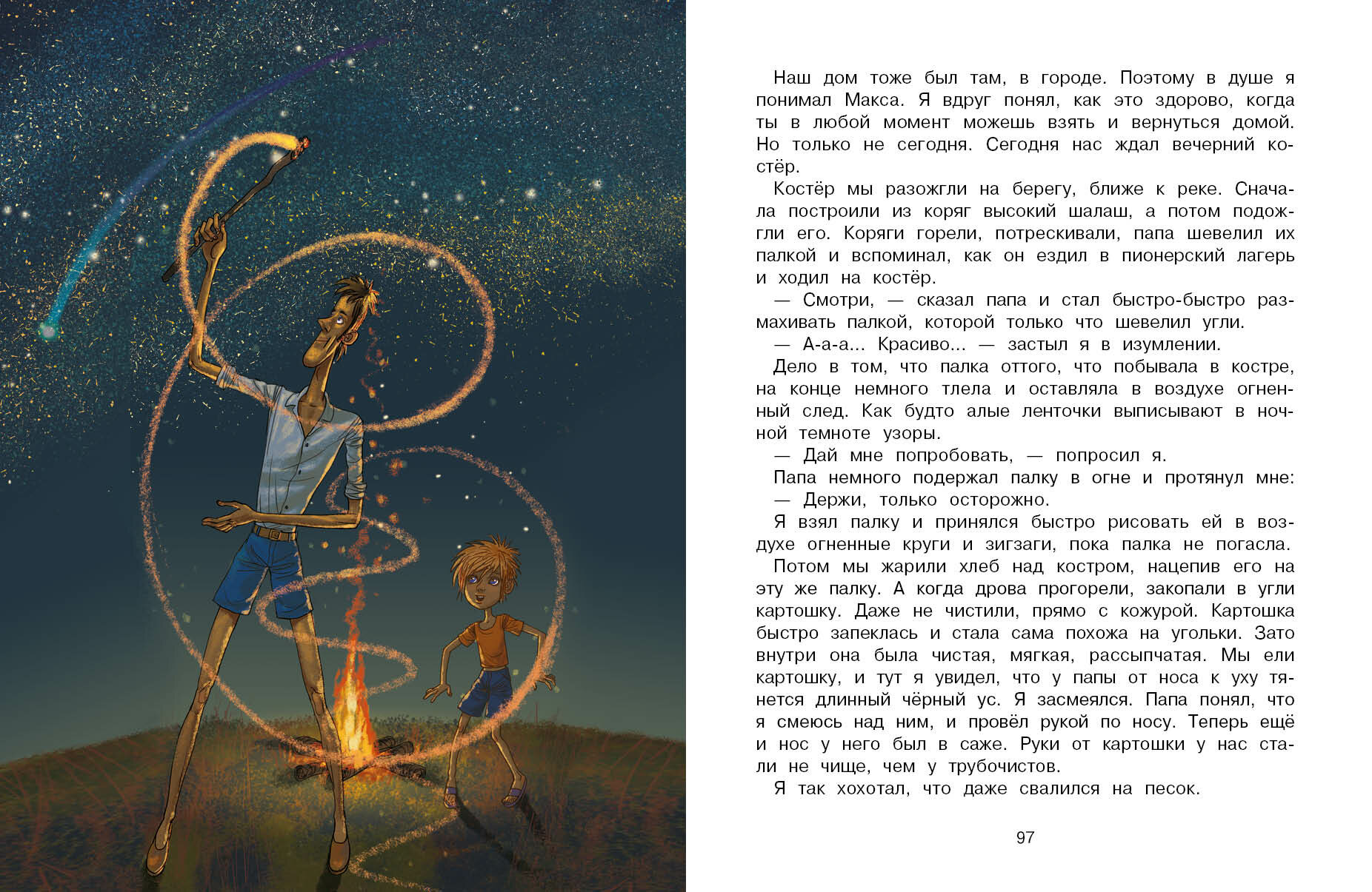 Как я соскучилась по таким книгам! Никакого безумства, никаких выкрутасов. НАКОНЕЦ-ТО! Все логично, жизненно, с юмором и главное очень интересно! Обычные вроде ситуации описаны так просто, понятно и увлекательно, что ты всему веришь. В этом и прелесть книги. Несмотря на нестандартную ситуацию она реалистичная! Это про нас). Приключений много, но это не остросюжетный детектив. Никто не голодает и не ест корешки. Было бы глупо, если бы папа отправился с ребенком в отпуск с палатками, не прихватив с собой все самое необходимое. Это книга о взаимоотношениях, много психологических моментов, очень правильно подмеченных. По ходу действия ты наблюдаешь, как меняется папа. Как развиваются отношения папы и сына, когда они становятся заложниками ситуации. Папа и раньше был хорошим, просто он забыл, как это быть ребенком. Мальчик тоже делает для себя много открытий. Книга полна познавательными моментами, но все это ненавязчиво, легко, так сказать, по ходу пьесы. Вот как, оказывается, полезно иногда остаться с ребенком вдвоем на необитаемом острове. И ничего, что он не в океане, а просто на реке. Главное ни работа, ни телефон, ни телевизор не мешают общению. А трудности только сближают. Понравился стиль, подача материала, картинка сразу вырисовывается перед глазами. Обожаю такое чтение, когда ты и ребенок на одной волне и оба вовлечены в сюжет. Когда и тебе не скучно, и ребенку интересно и все понятно. Это тоже сближает). А какие шикарные иллюстрации! И на каждой странице! Шикарная книга. СУПЕР! СПАСИБО!