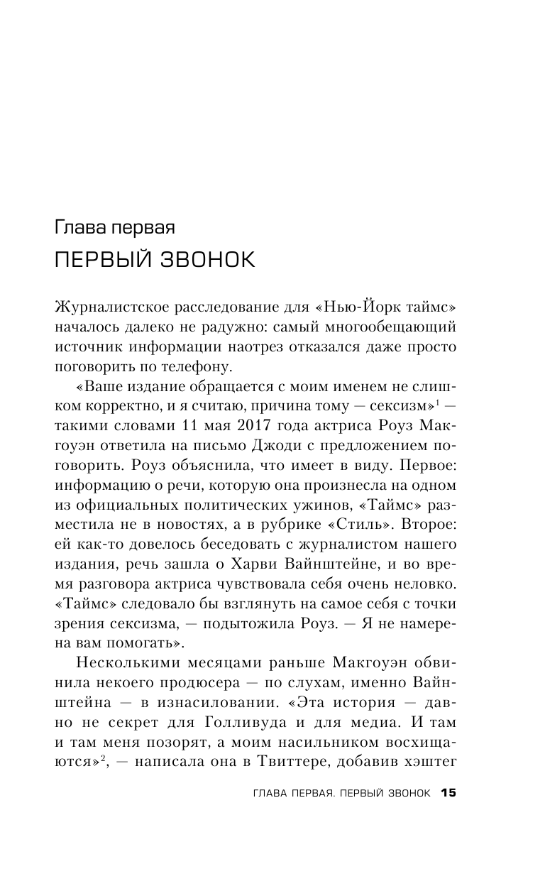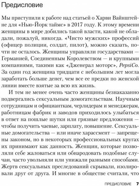 Журналистки Джоди Кантор и Меган Тухи, написавшие сенсационную статью, рассказывают, как проходило их расследование. Как выявлялись случаи домогательств, положившие конец карьере многих женщин; как тяжело было уговорить голливудских актрис поделиться своей историей; и как Вайнштейн саботировал их работу, нанимая юристов и шпионов. Почти детективная, эта книга мгновенно стала образцом безупречного журналистского расследования и изменила ход современной истории.