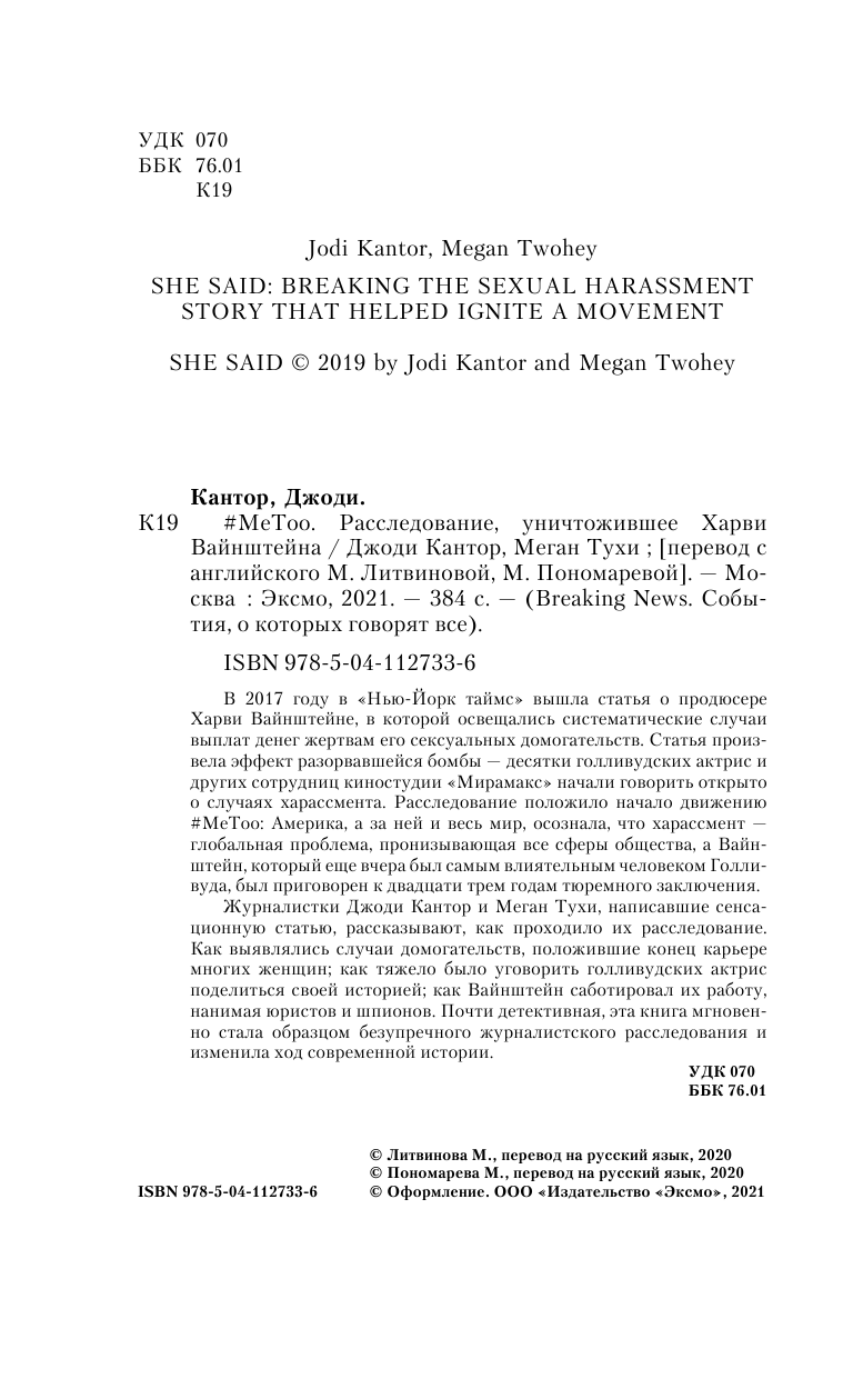 #MeToo. Расследование уничтожившее Харви Вайнштейна (Джоди Кантор, Меган Тухи); Эксмо, Редакция 1, 2020