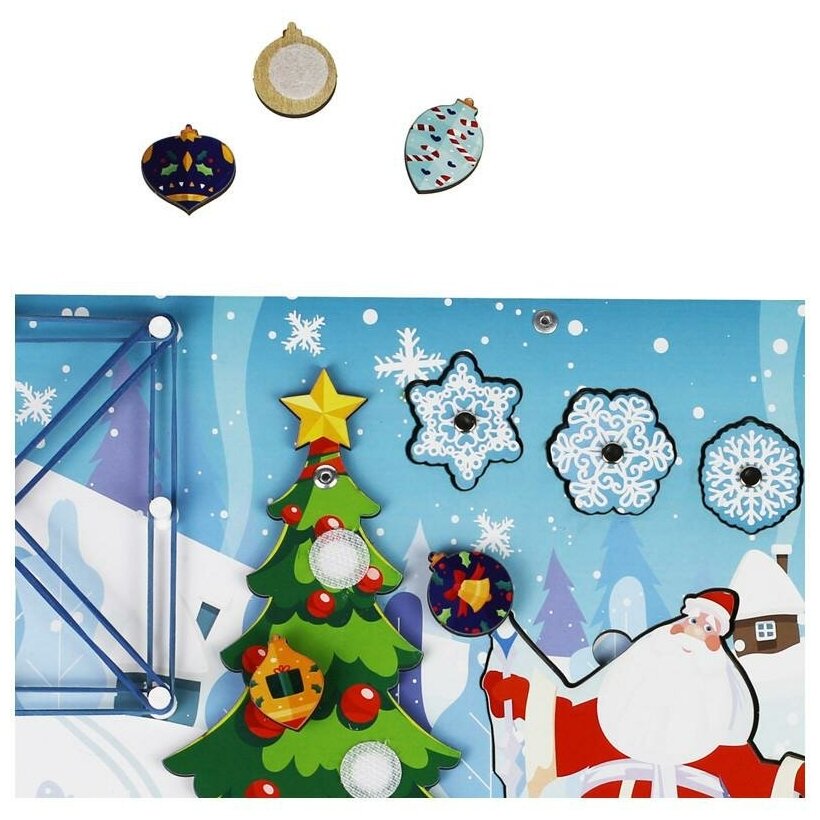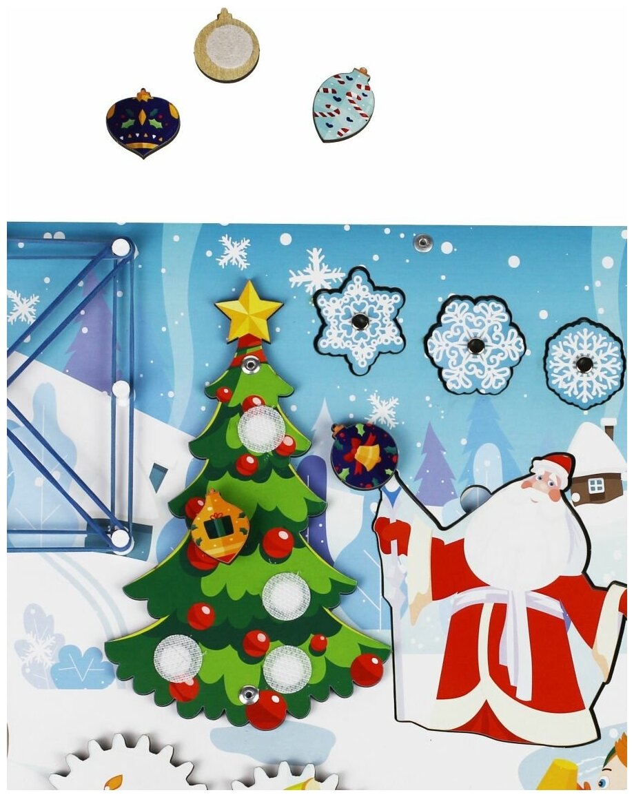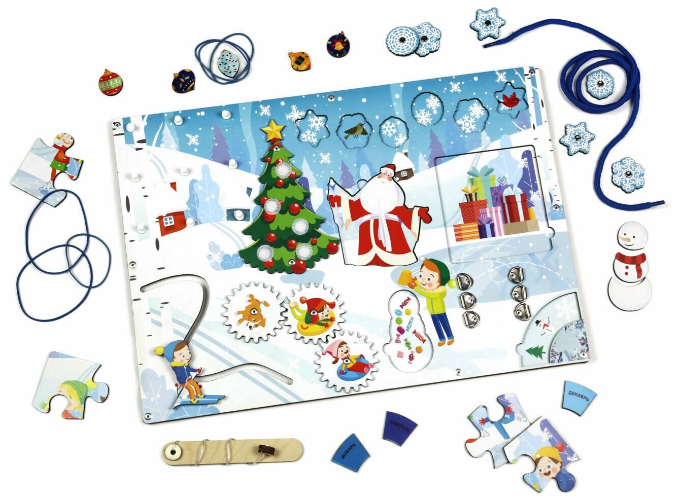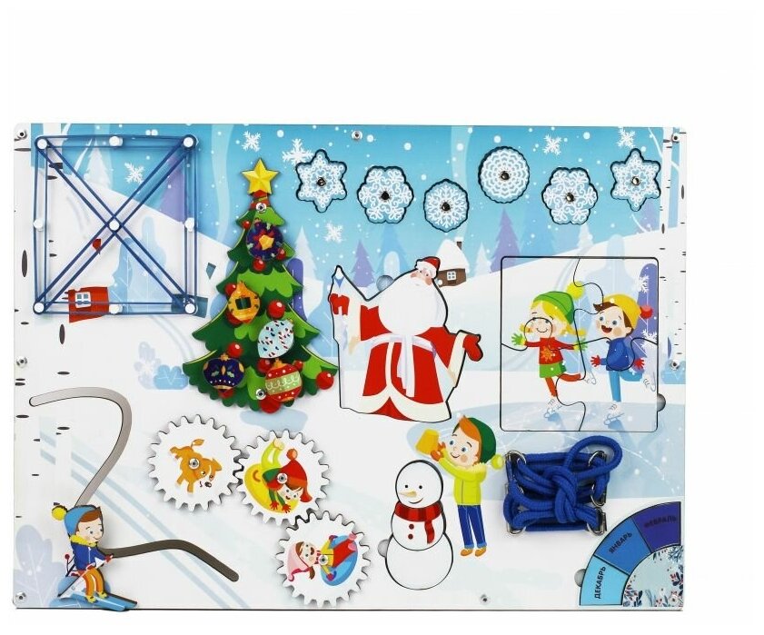 Три Шестеренки приходят в движение, если покрутить любую из них. Липучки - детали с липучками можно прилеплять, отлеплять менять местами. Шнуровка - используя шнурок и петельки можно создать красивые украшения. Пазл с изображением детей на конках закрывает картинку с подарками. Рыбалка - с помощью удочки с магнитом нужно выловить все снежинки, а затем вставить обратно каждую на свое место.