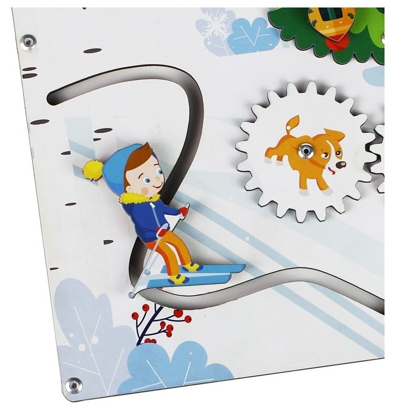 Бизиборд Зима - это многофункциональная игрушка – тренажер для развития мелкой моторики, знакомства с окружающим миром, формирования элементарных бытовых навыков. Бизиборд представляет собой деревянный планшет с тематическими изображениями, условно разделенный на игровые зоны с различными функциональными элементами. Под Вкладышами с названиями зимних месяцев ребенок найдет картинки, выражающие особенности каждого месяца. Под остальными вкладышами также скрываются интересные картинки. По извилистой дорожке Лабиринта катается лыжник.