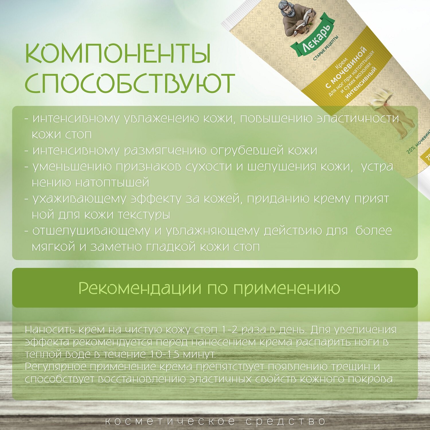 Крем рекомендуется применять как смягчающее средство при натоптышах, сухих мозолях, огрубевшей коже, шелушениях, трещинах на пятках, для снятия усталости и чувства тяжести в ногах.