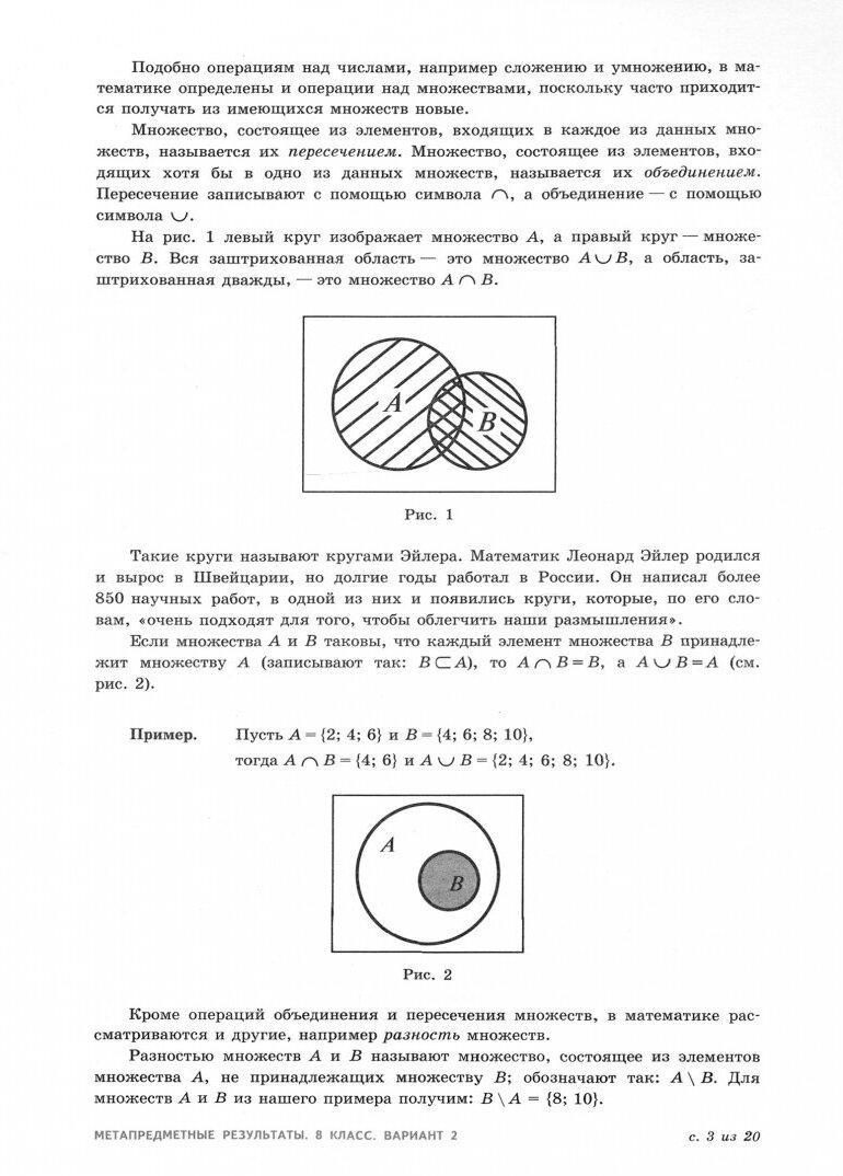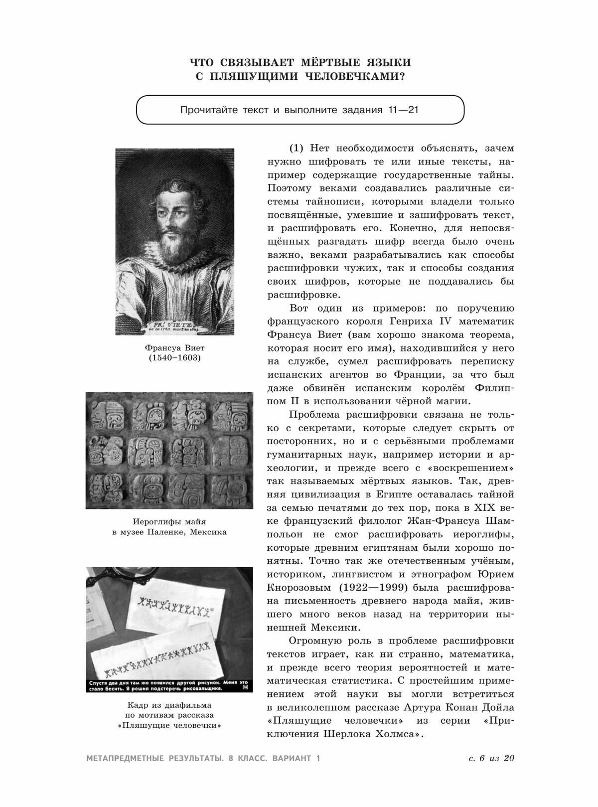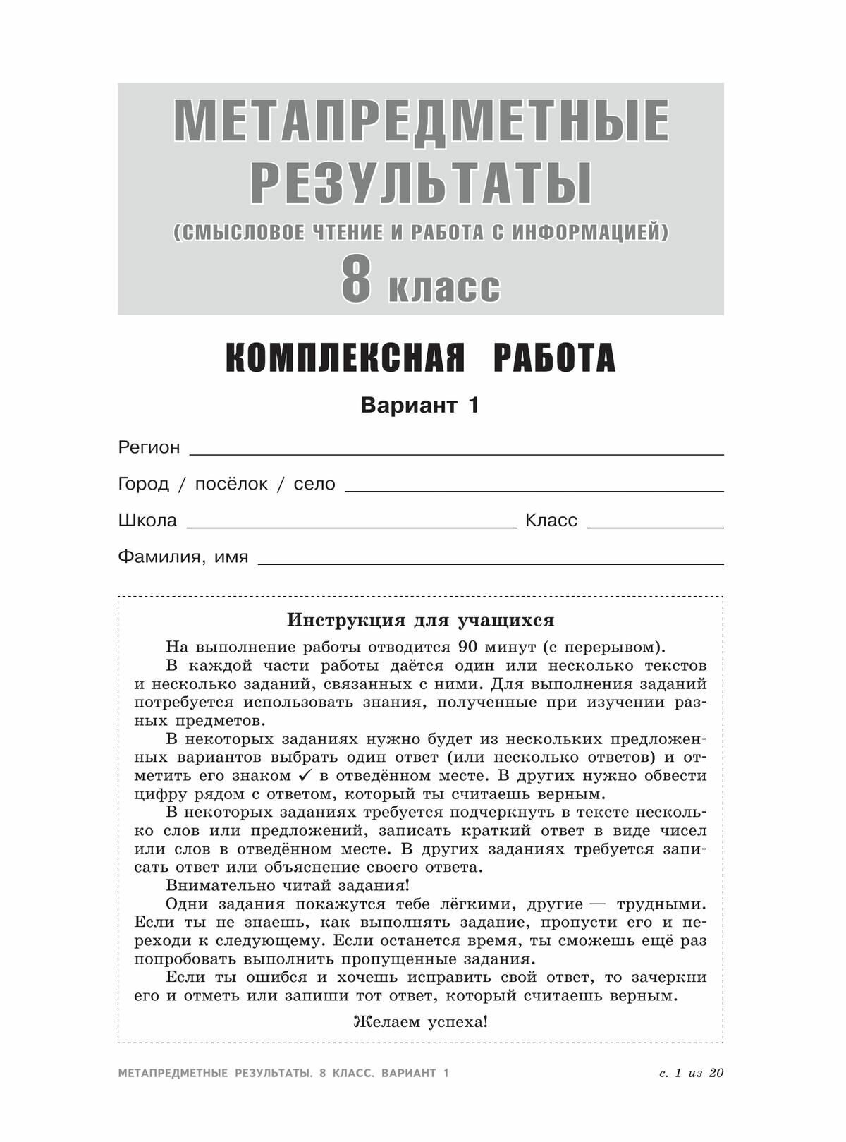 Предлагаются четыре варианта комплексной работы для оценки читательской грамотности учащихся 8-го класса. Каждый вариант включает текст/тексты по четырём предметным областям (русскому языку, математике, естествознанию, истории/обществознанию) и задания к ним, направленные на оценку сформированности читательских умений.