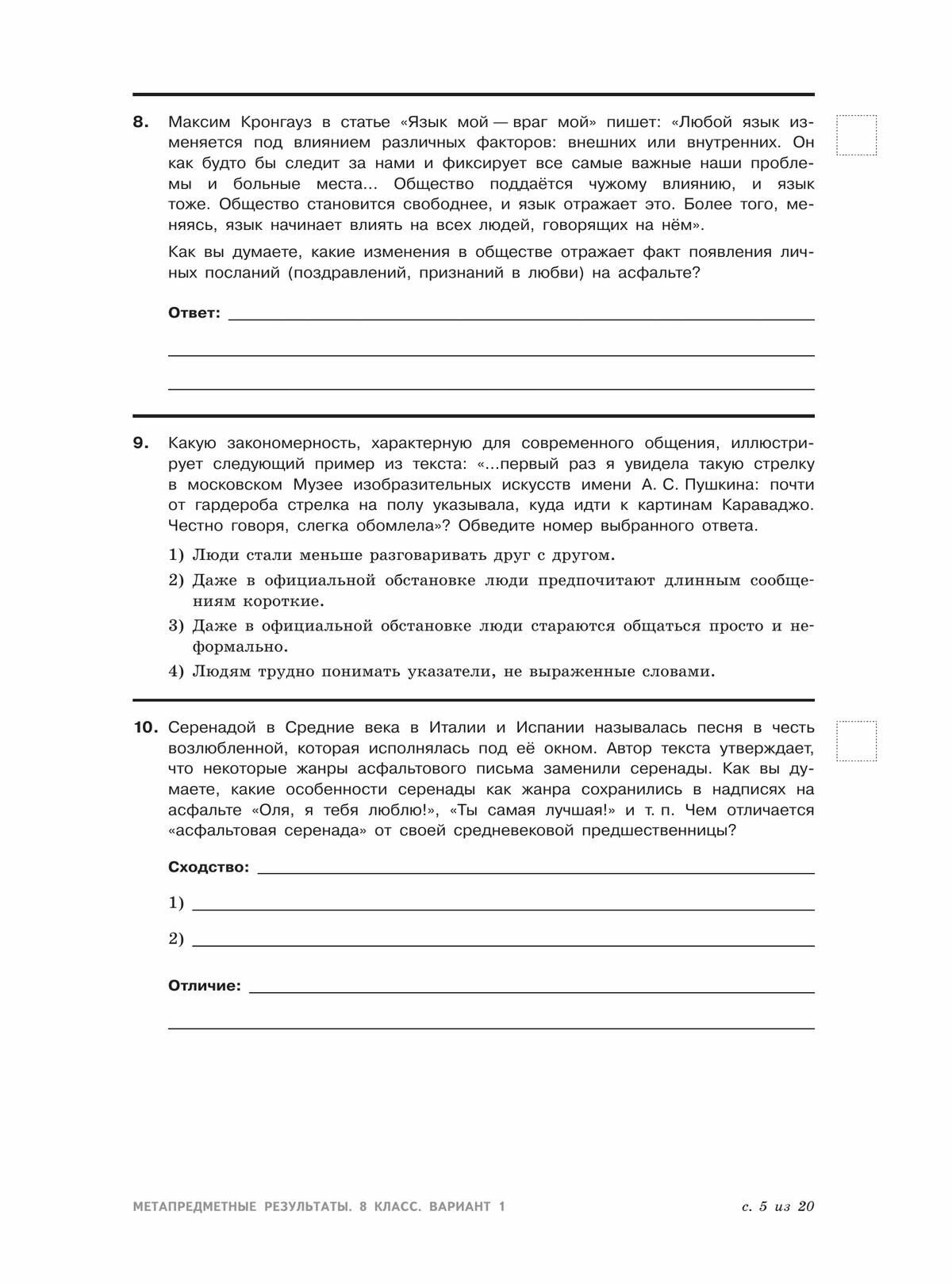 Издание предназначено для проведения в конце учебного года промежуточной аттестации учащихся 8-го класса с целью внутришкольного мониторинга сформированности важнейшего мета- предметного результата - смыслового чтения (читательской грамотности), являющегося основой обучения в школе.
