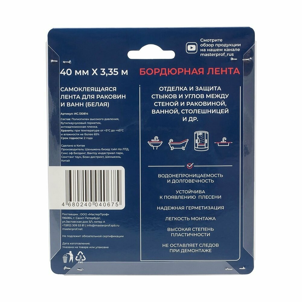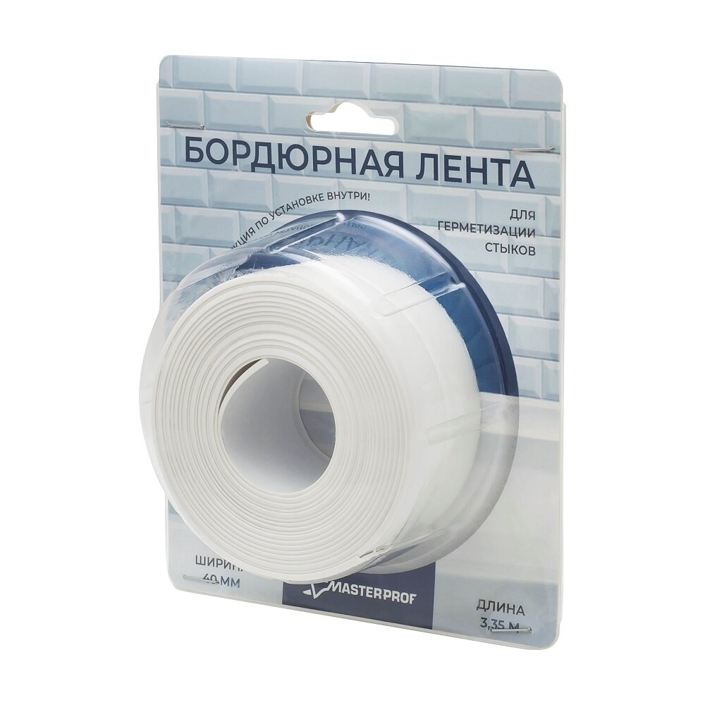Бордюрная лента (40 мм.) 3.35 м., белая, для ванной предназначена для герметизации стыка между сантехническими изделиями и отделочными материалами стен в ванной комнате. Упаковка - п/э блистер.