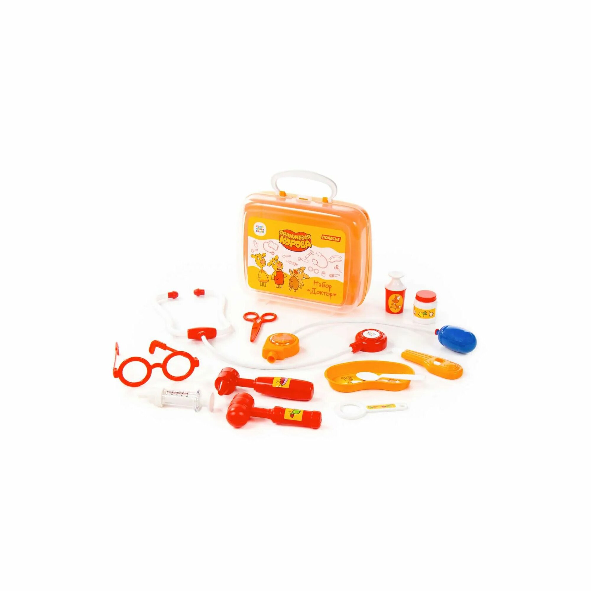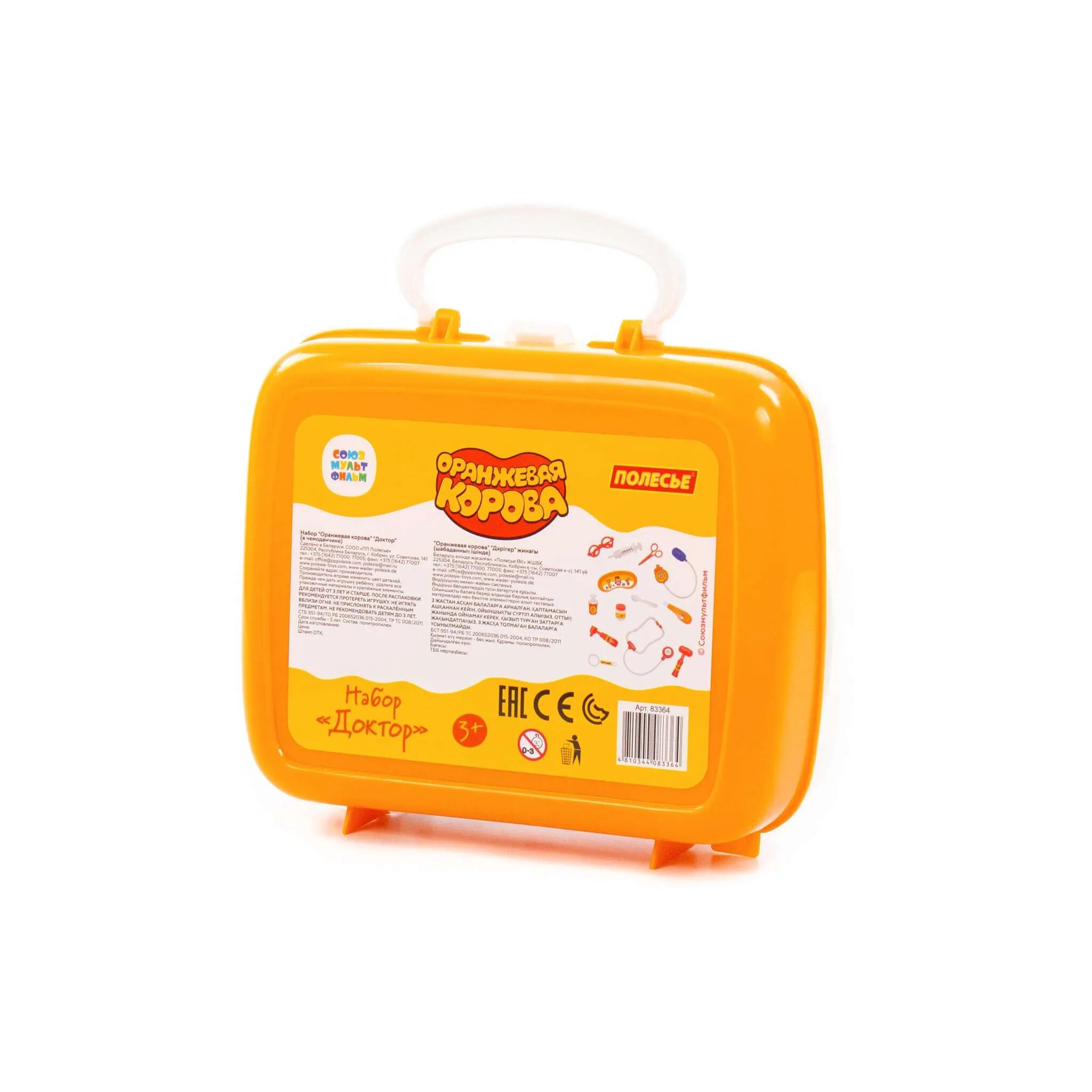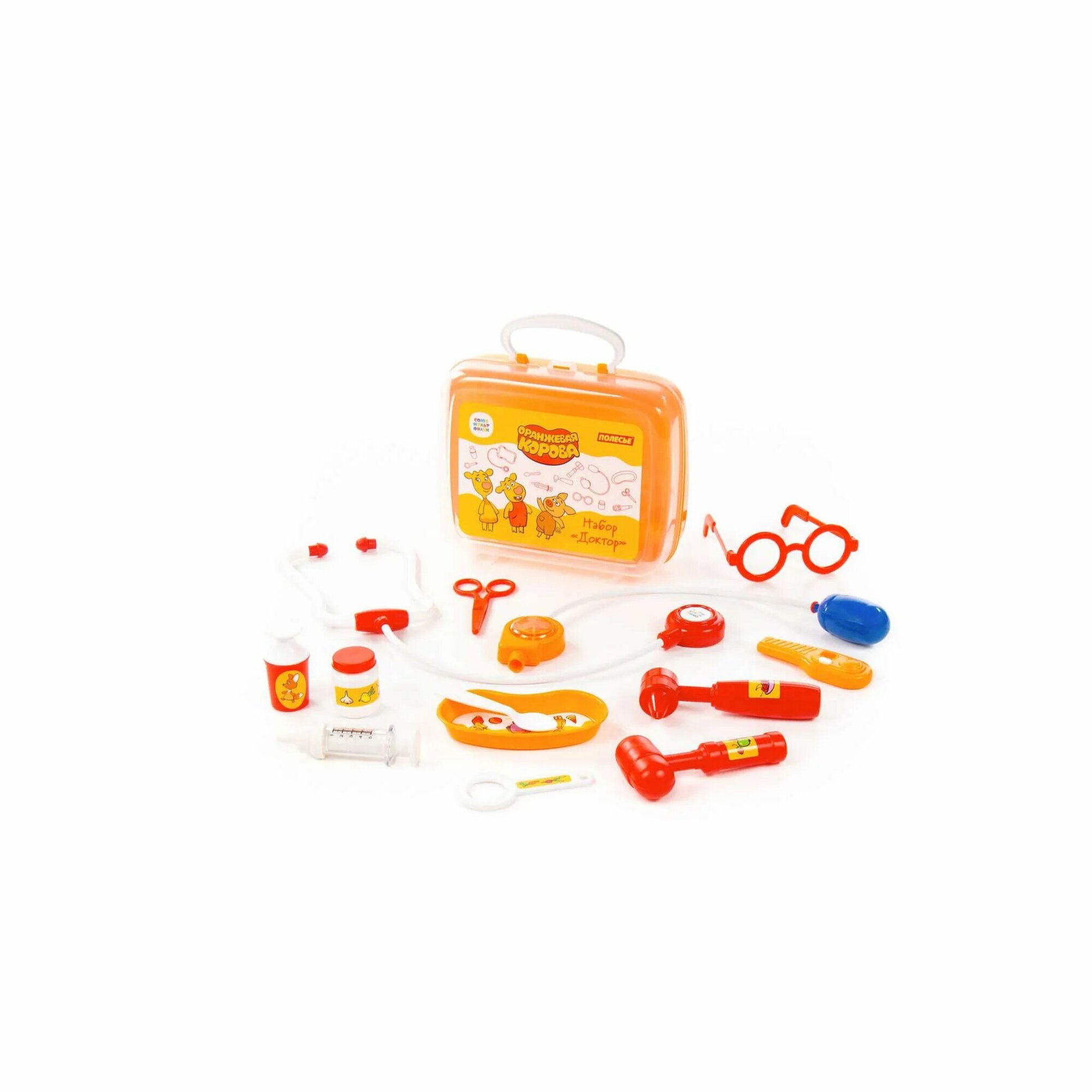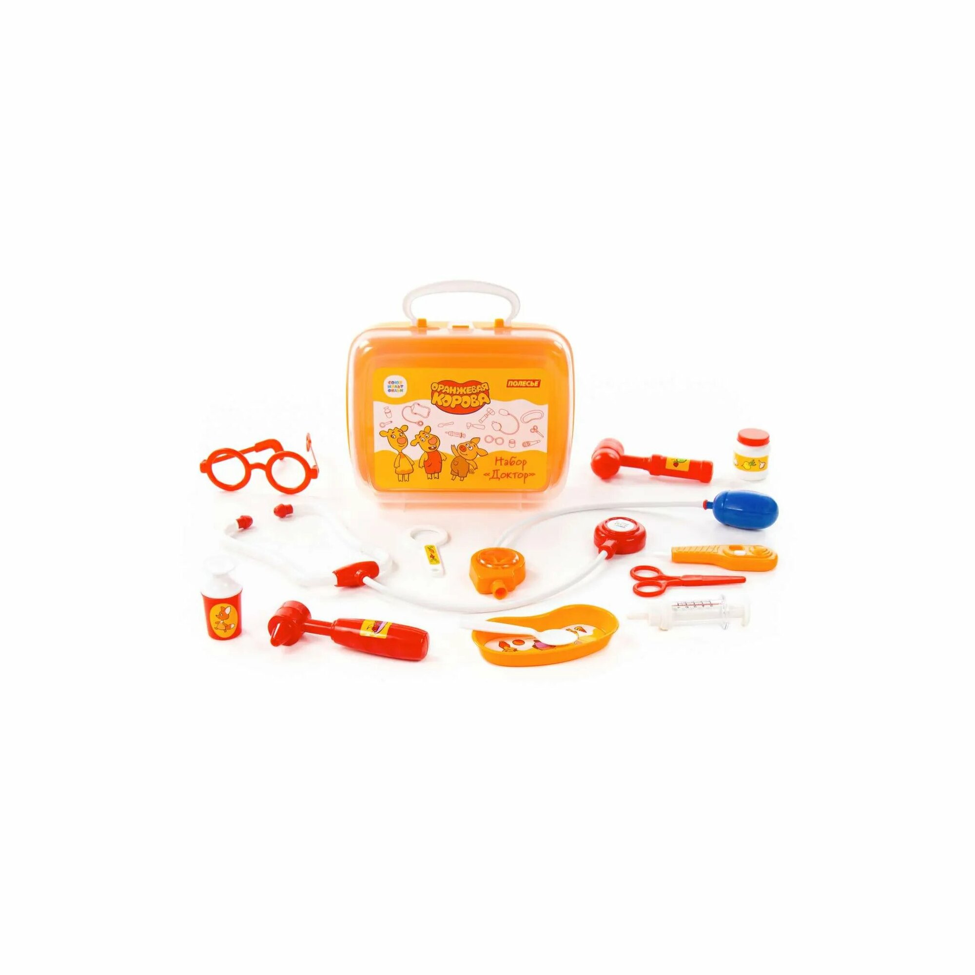 В детстве можно стать врачом за считанные минуты! С универсальным набором «Доктор» провести приём пациентов и назначить лечение гораздо интереснее. Игровой набор Доктор «Оранжевая корова» в чемоданчике от компании «Полесье» рекомендован детям с трёх лет. Он способствует развитию фантазии и коммуникативным навыкам у дошкольников, знакомит с профессией врача, способствуют формированию абстрактного мышления. Все инструменты компактно умещаются в упаковке-чемоданчике, что позволяет удобно перемещать и хранить набор.В комплект входят:— ножницы — 1 шт.,— очки — 1 шт.,— лупа — 1 шт.,— шприц — 1 шт.,— лоток для инструментов — 1 шт.,— ложечка — 1 шт.,— стетоскоп (для прослушивания сердца и лёгких) — 1 шт.,— тонометр (для измерения давления) — 1 шт.,— отоскоп (инструмент лор-врача) — 1 шт.,— молоточек — 1 шт.,— баночки — 2 шт.,— термометр — 1 шт.