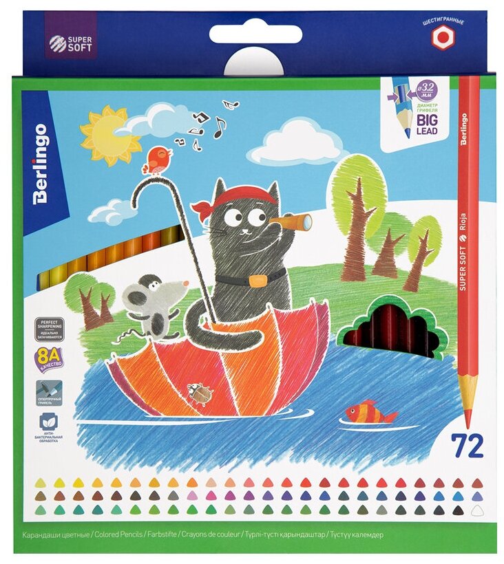 SuperSoft - линейка качественно новых цветных карандашей Berlingo. 72 цвета. Эргономичная трехгранная форма. Указание цвета на каждом карандаше на английском языке. Поле для подписи имени владельца на каждом карандаше. Упаковка в плотную матовую картонную коробку со склеенным европодвесом.