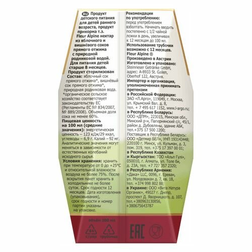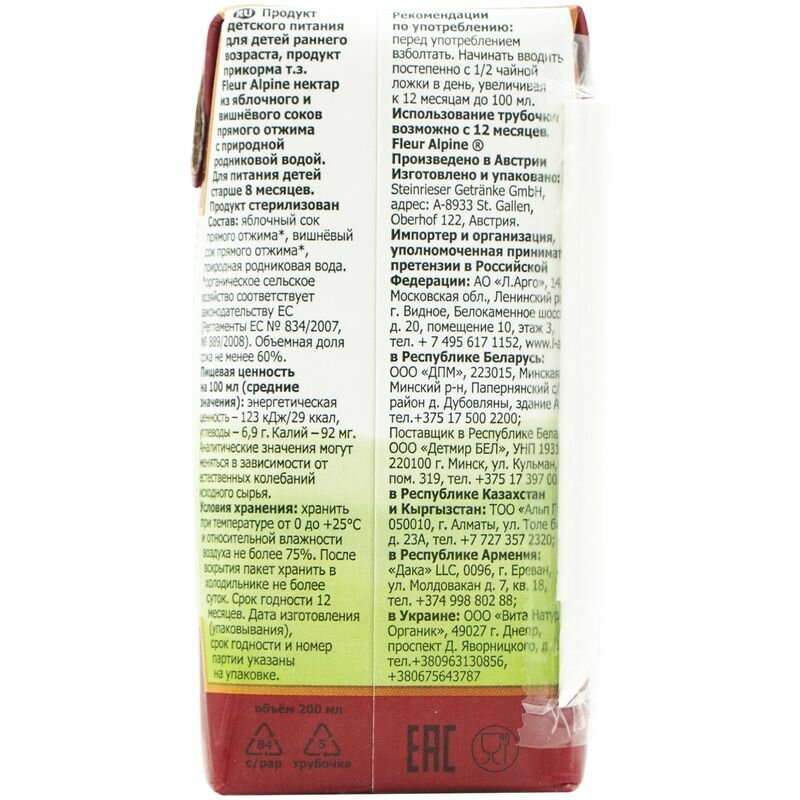 Продукт детского питания для детей раннего возраста, продукт прикорма Fleur Alpine нектар из яблочного и вишнёвого соков прямого отжима с природной родниковой водой. Для питания детей старше 8 месяцев. Продукт стерилизован.