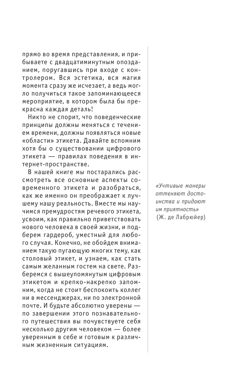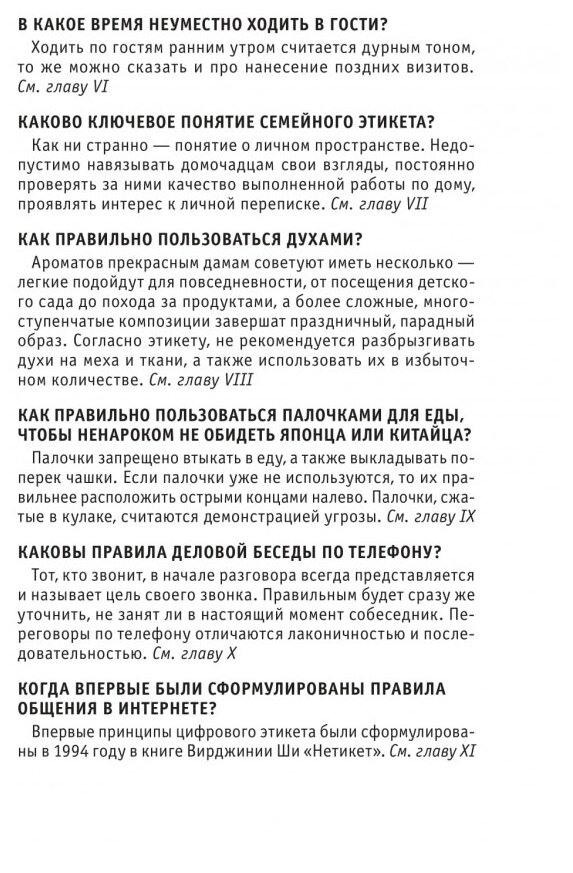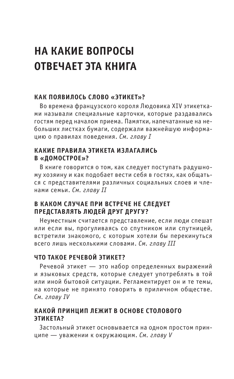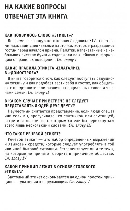Этикет - свод правил поведения - зародился в глубокой древности, а слово для обозначения этих правил появилось в обозримом прошлом, при дворе Людовика XIV. Он занимает весьма значительное место в политике, культуре, образовании. Но не менее важен он и в повседневности, в обычном общении, не выходящим за рамки семьи и трудового коллектива. Ведь этикет - это не только руководство, как быть вежливым и воспитанным. Это еще и способ наладить хорошие взаимоотношения с людьми - членами семьи, друзьями, работодателями, коллегами. Знание особенностей этикета, основанного на традициях и заимствованиях, поможет и при поездке за рубеж. Как правильно вести себя на собеседовании? На званом вечере? В театре? Обо всем этом и многом другом рассказывается в нашей книге.