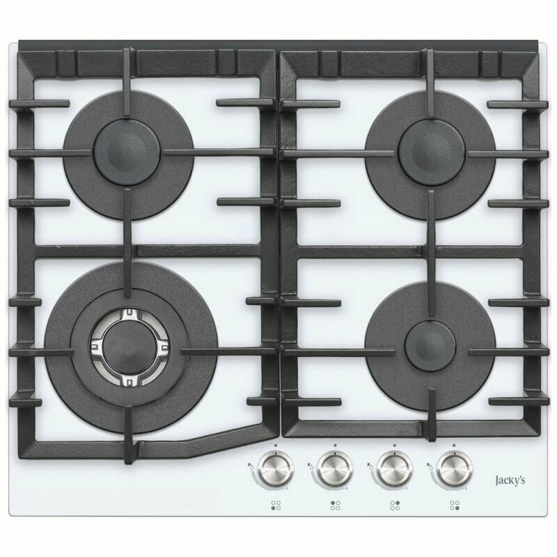 Газовая варочная панель Jacky’s выполнена из закаленного стекла в белом цвете. Благодаря независимой конструкции панель может быть размещена в любом месте независимо от расположения духового шкафа. Цельные чугунные решетки, WOK горелка, электроподжиг в кнопке и газ-контроль конфорок делают эту панель незаменимой и удобной в использовании.Основные технологические особенности:Итальянские горелки SABAF. Современная конструкция конфорки позволяет экономить потребление газа. Благодаря двойному кольцу пламени повышается производительность варочной поверхности, а подогрев и приготовление блюд происходят более равномерно.WOK адаптер. Конфорка WOK позволяет готовить любимые блюда высокой кухни правильно и быстро. Адаптер существенно облегчает процесс использования посуды со сферическим дном или с большим диаметром.Основные дизайнерские особенности:Чугунные решетки с амортизаторами. Чугун устойчив к деформации от высоких температур и хорошо очищается от застывшего жира и нагара. Благодаря амортизаторам поверхность находится в неподвижном состоянии, а на ее поверхности без труда размещается даже объемная и тяжелая посуда.Закаленное стекло. Имеет премиальный внешний вид, устойчиво к царапинам и отлично очищается от загрязнений.Современный дизайн. Газовая панель аккуратно встраивается в кухонную мебель и смотрится гармонично в любом интерьере аналогичного стиля.Основные параметры безопасности:Газ-контроль. Сегодня безопасность – один из самых важных критериев при выборе бытовой техники. Газ-контроль отключает подачу газа при его случайном затухании.Поджиг в кнопке. Благодаря встроенному в ручке электроподжигу Cast Futura процесс розжига стал быстрым, удобным и безопасным.