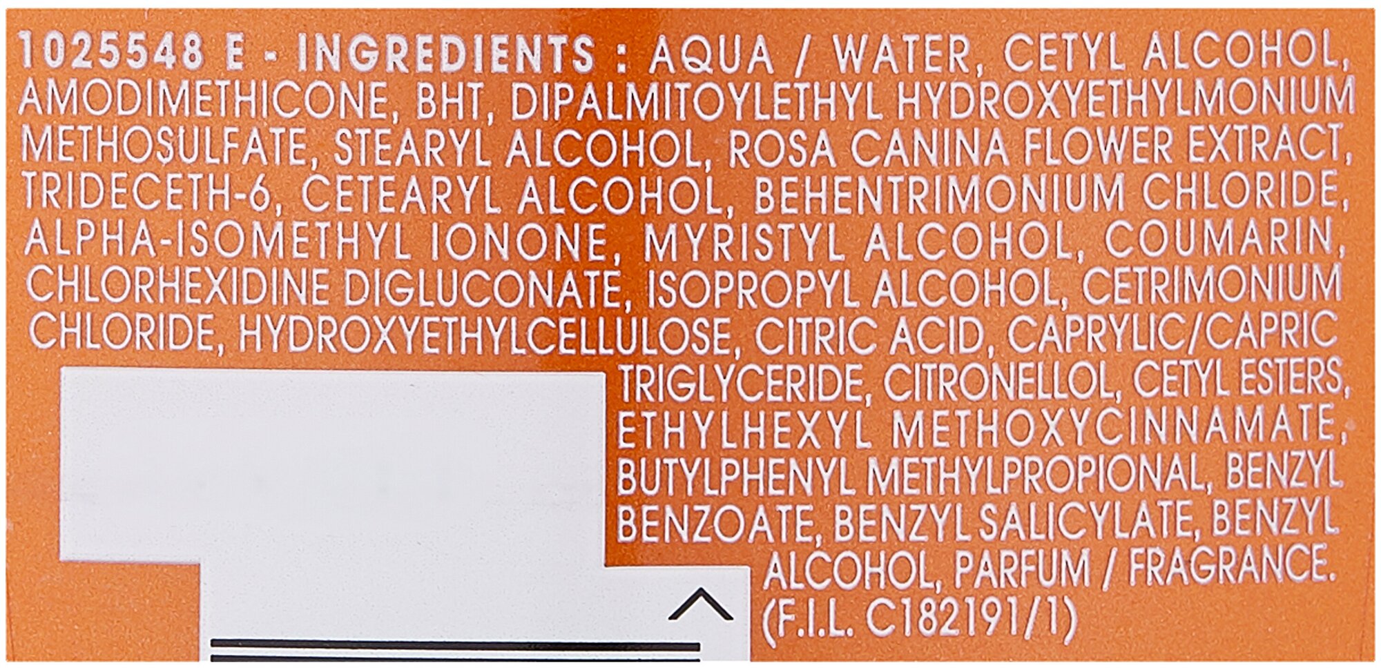 | Состав | aqua/water, cetyl alcohol, amodimethicone, dipalmitoylethyl hydroxyethylmonium methosulfate, trideceth-6, cetearyl alcohol, behentrimonium chloride, methylparaben, alpha-isomethyl ionone, myristyl alcohol, coumarin, chlorhexidine dihydrochloride, camphor benzalkonium methosulfate, isopropyl alcohol, cetrimonium chloride, hydroxyethylcellulose, citric acid, citronellol, cetyl esters, butylphenyl methylpropional, benzyl benzoate, benzyl salicylate, parfum/fragrance |